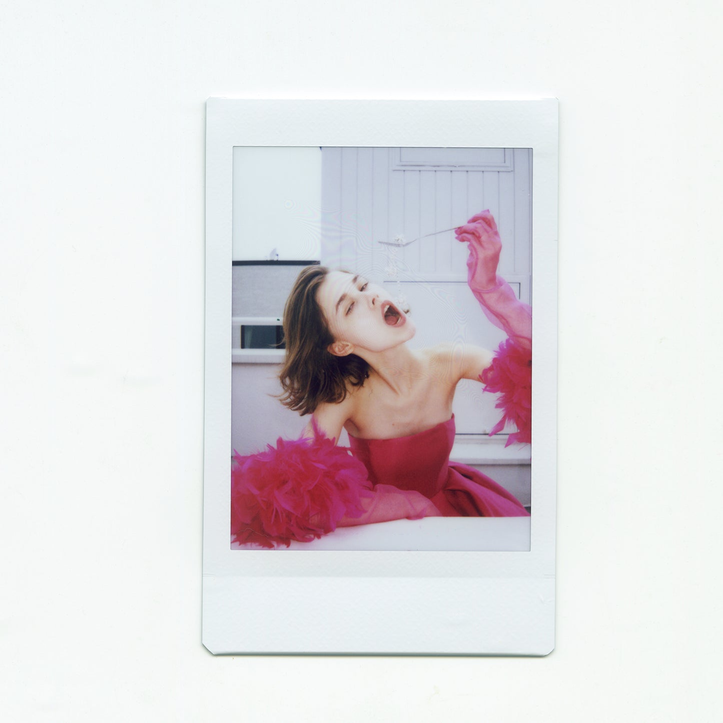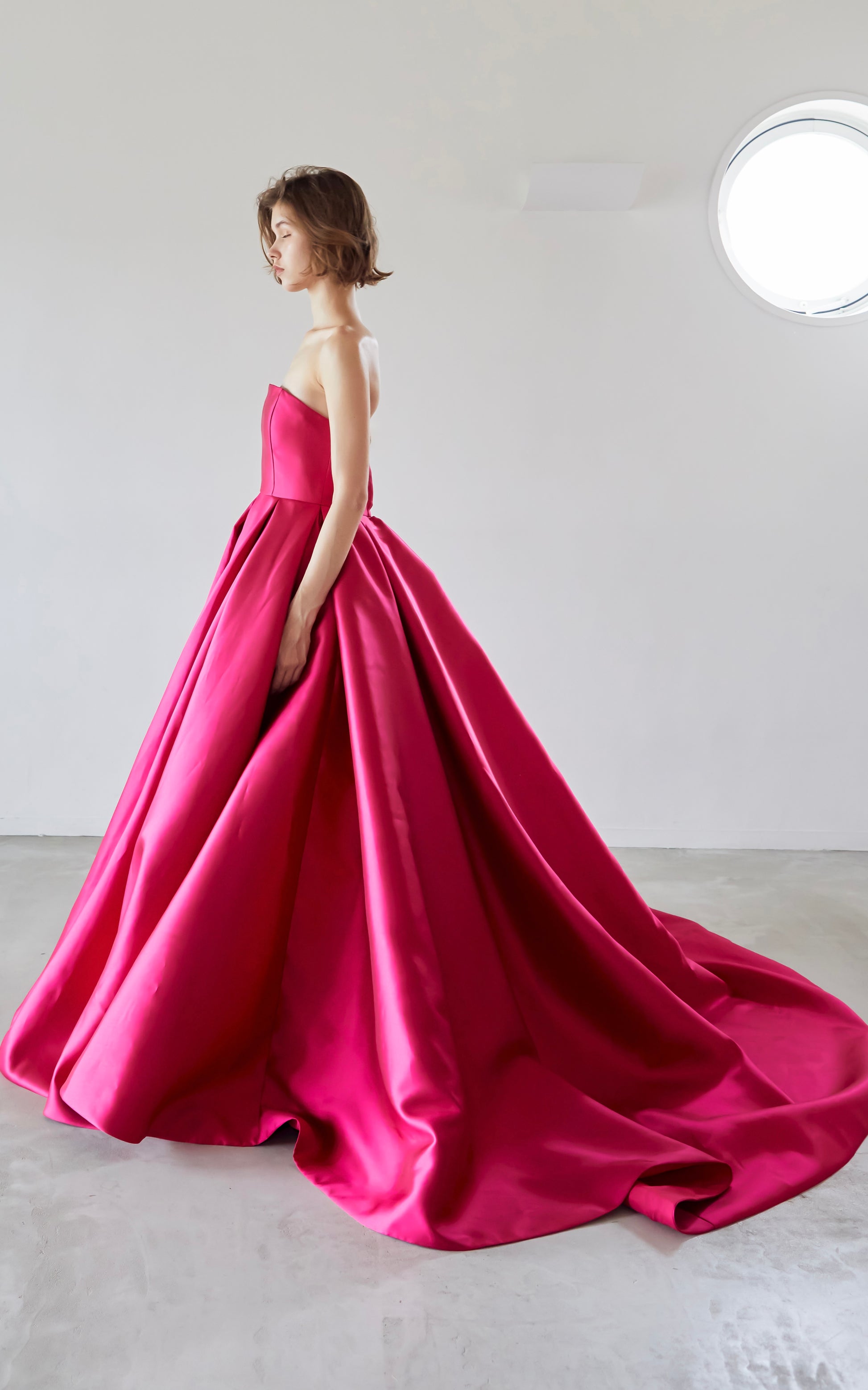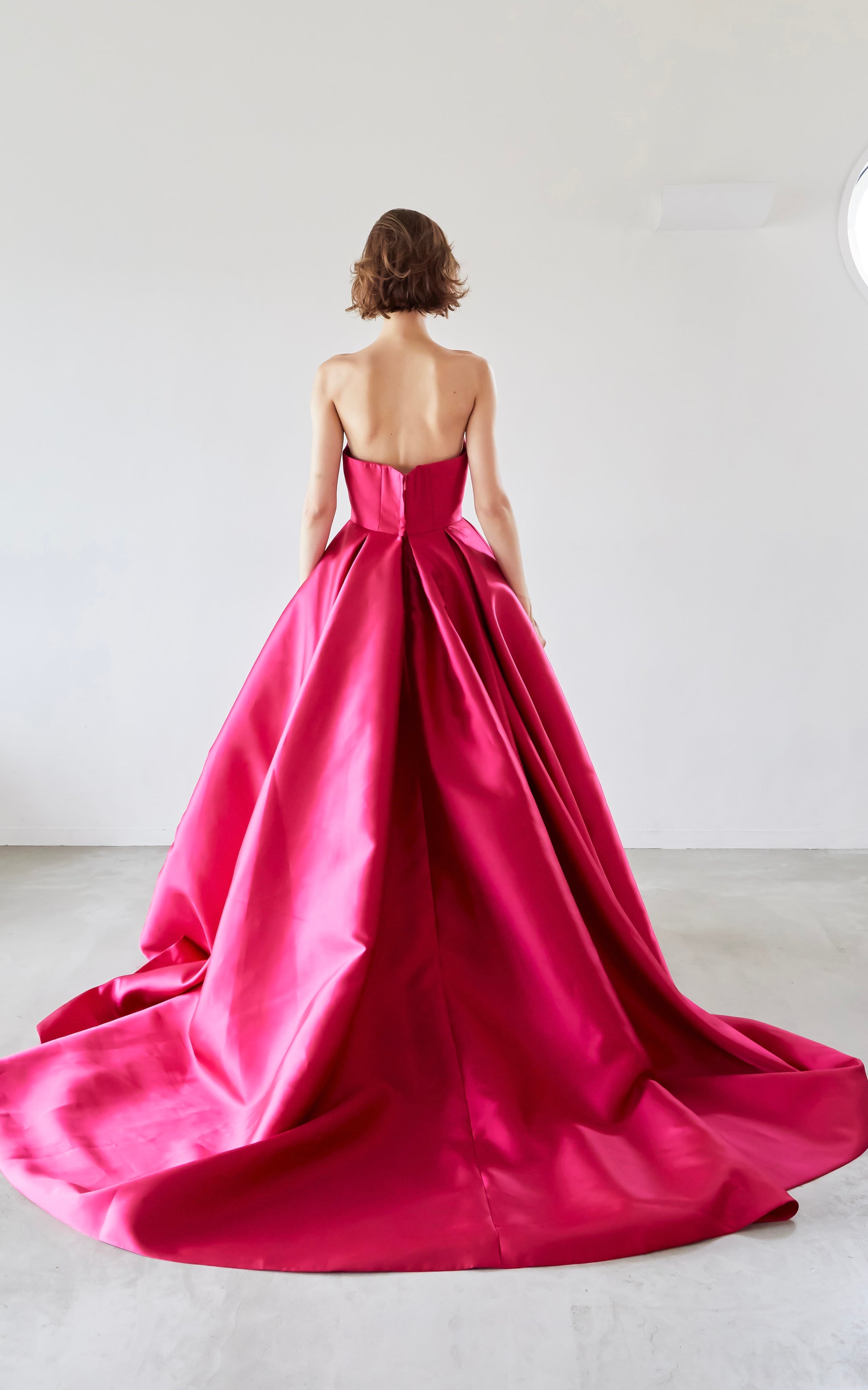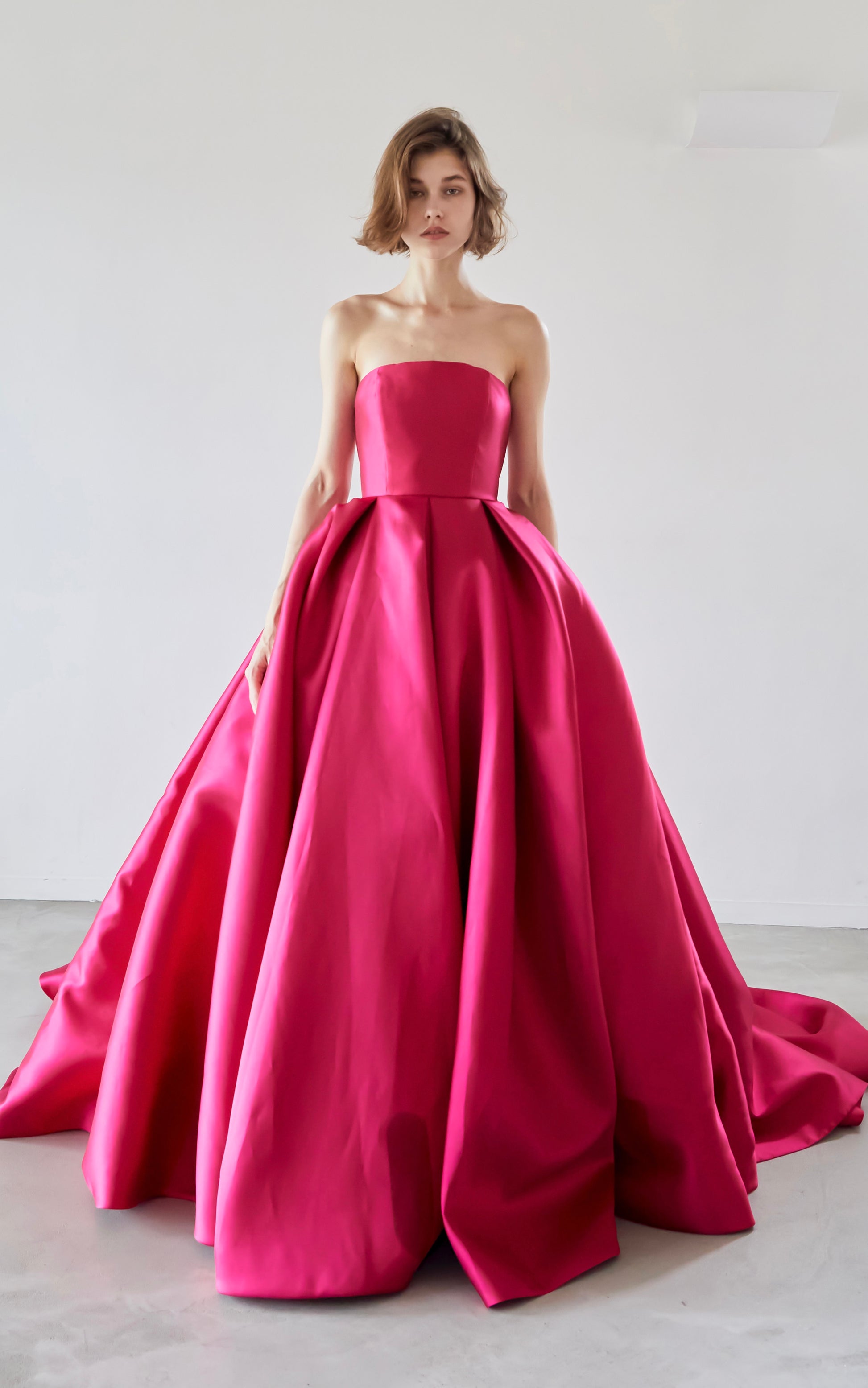 A pink A-line dress made of high-quality mikado satin with a beautiful luster.