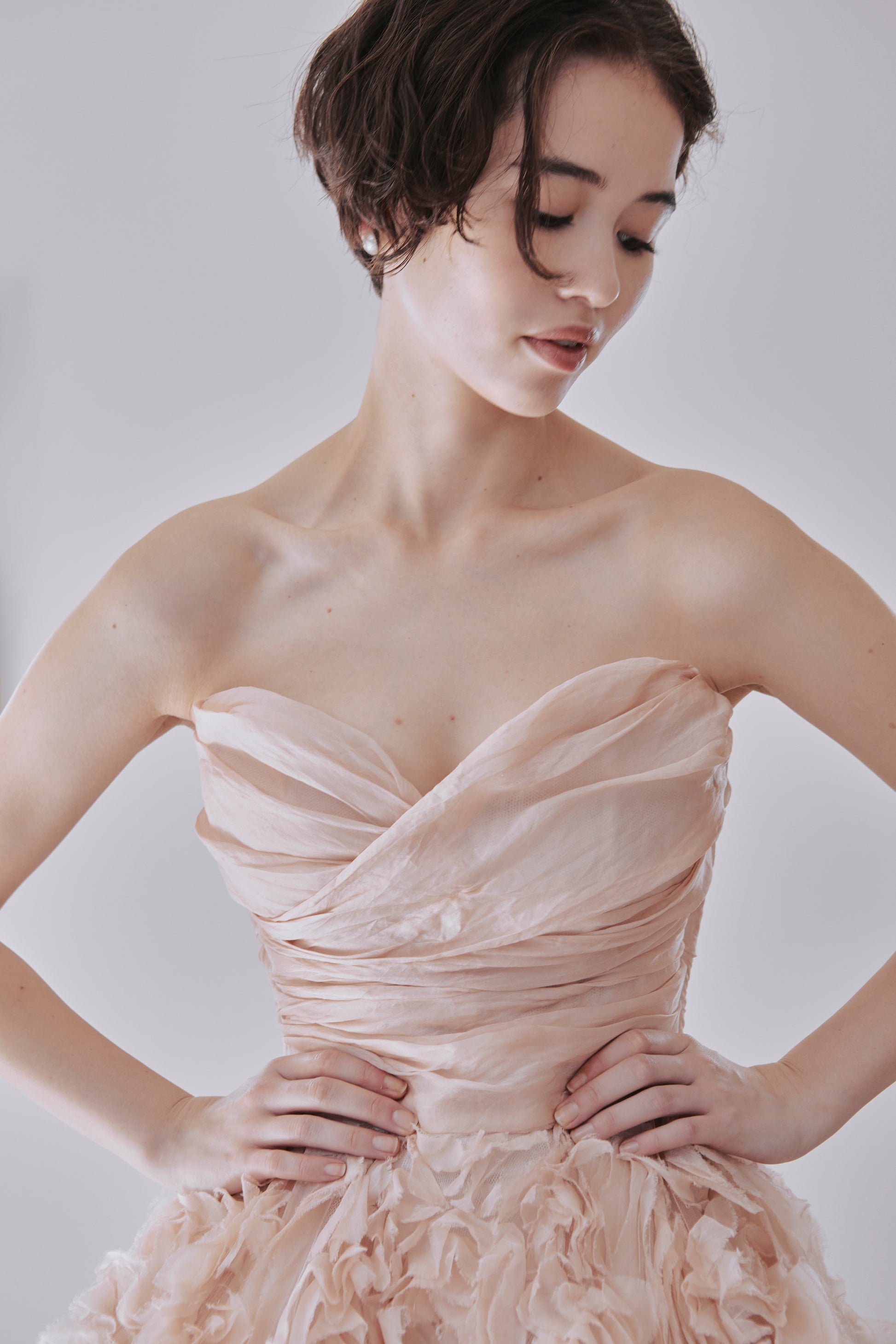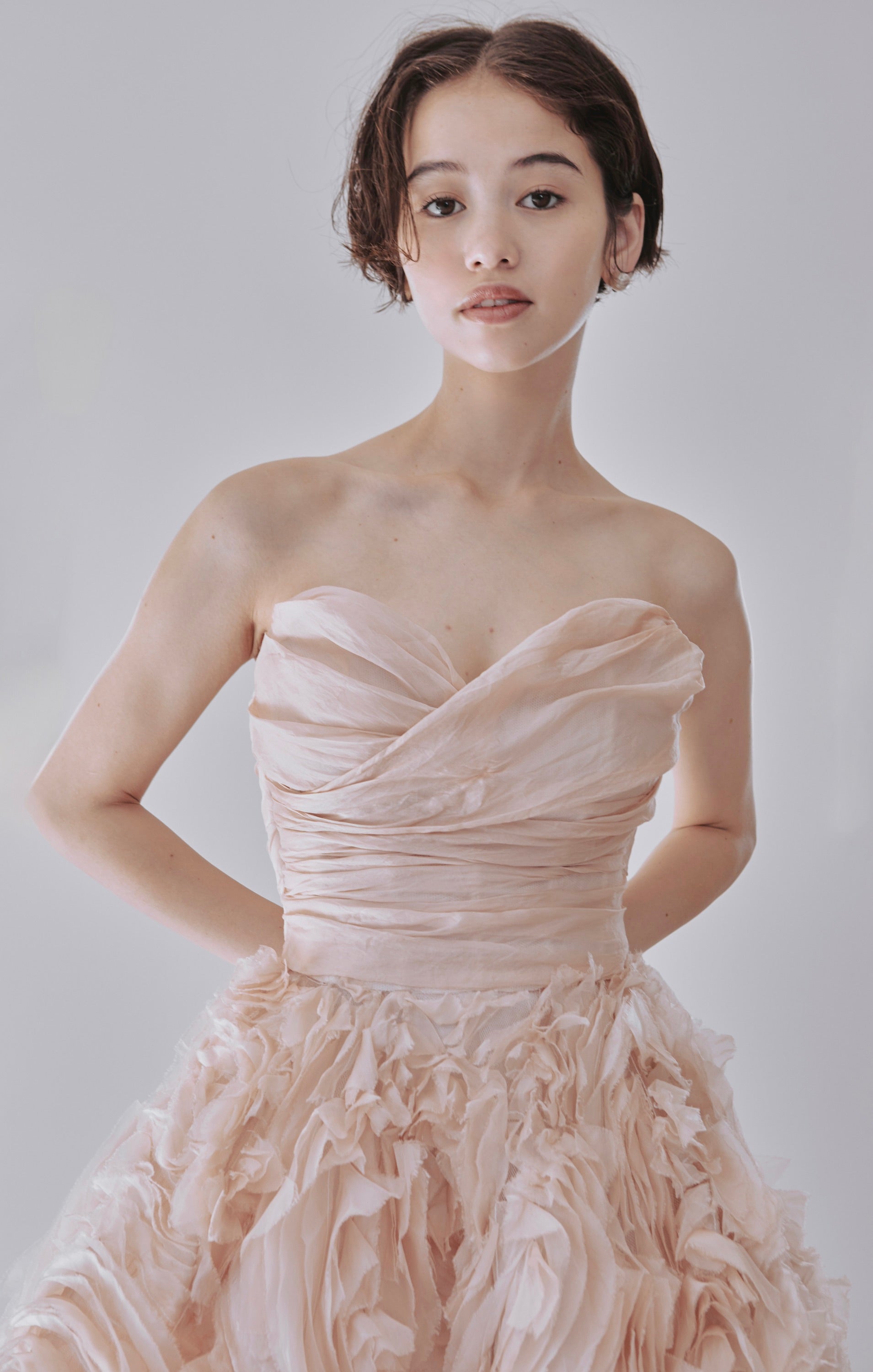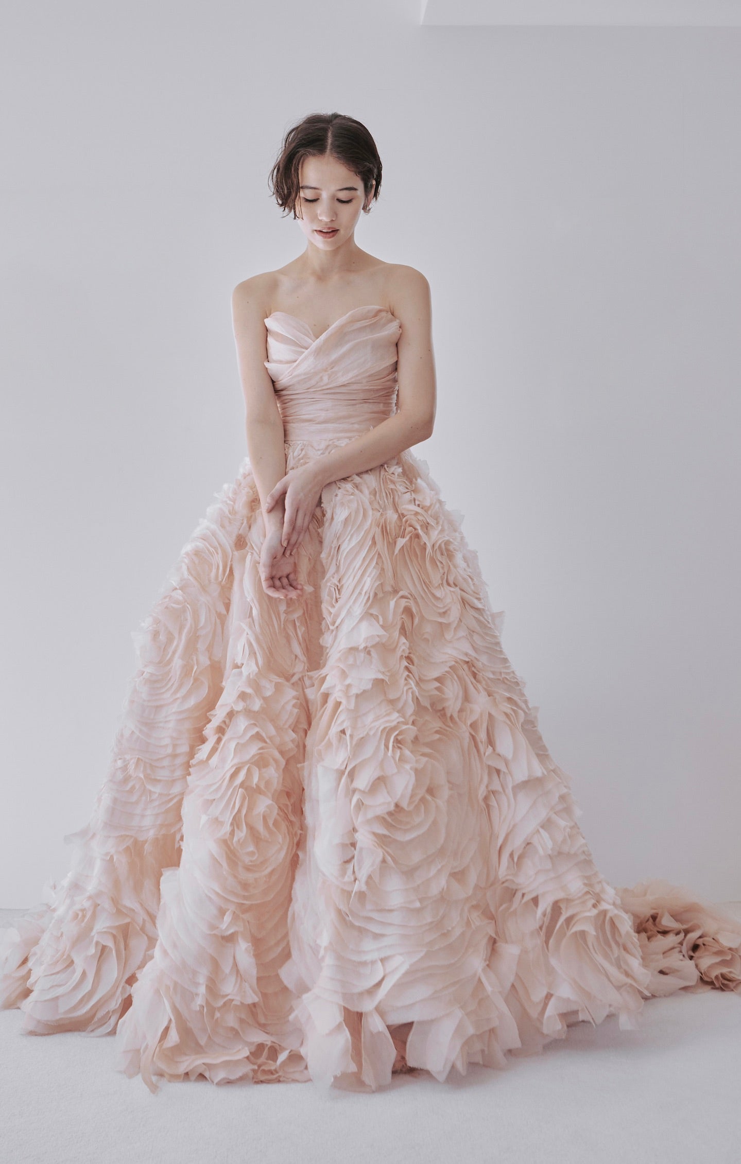 A dress made of multiple layers of cream-colored tulle.
