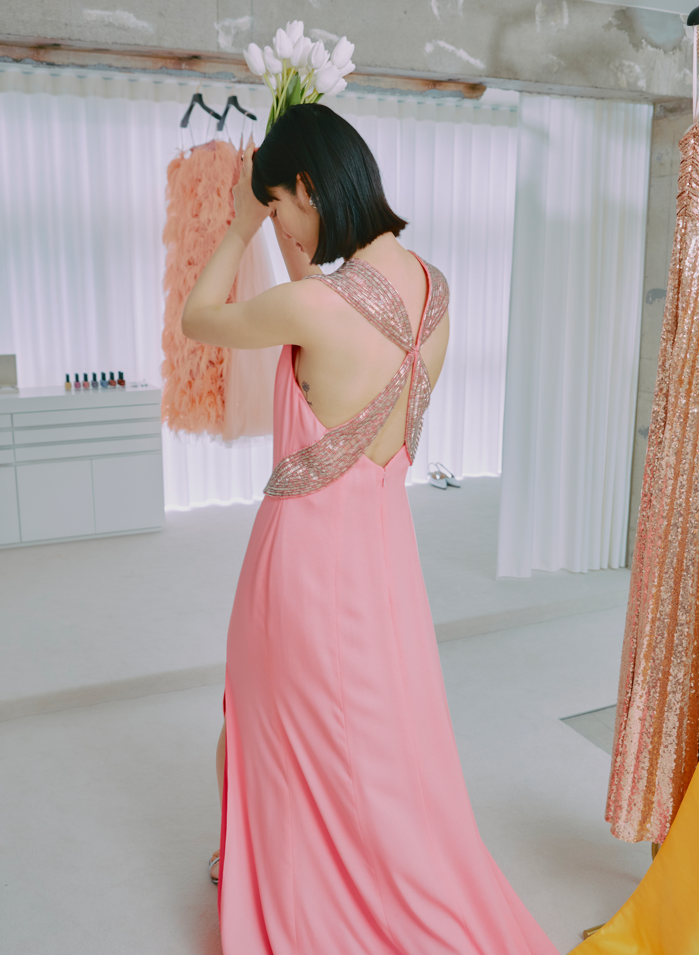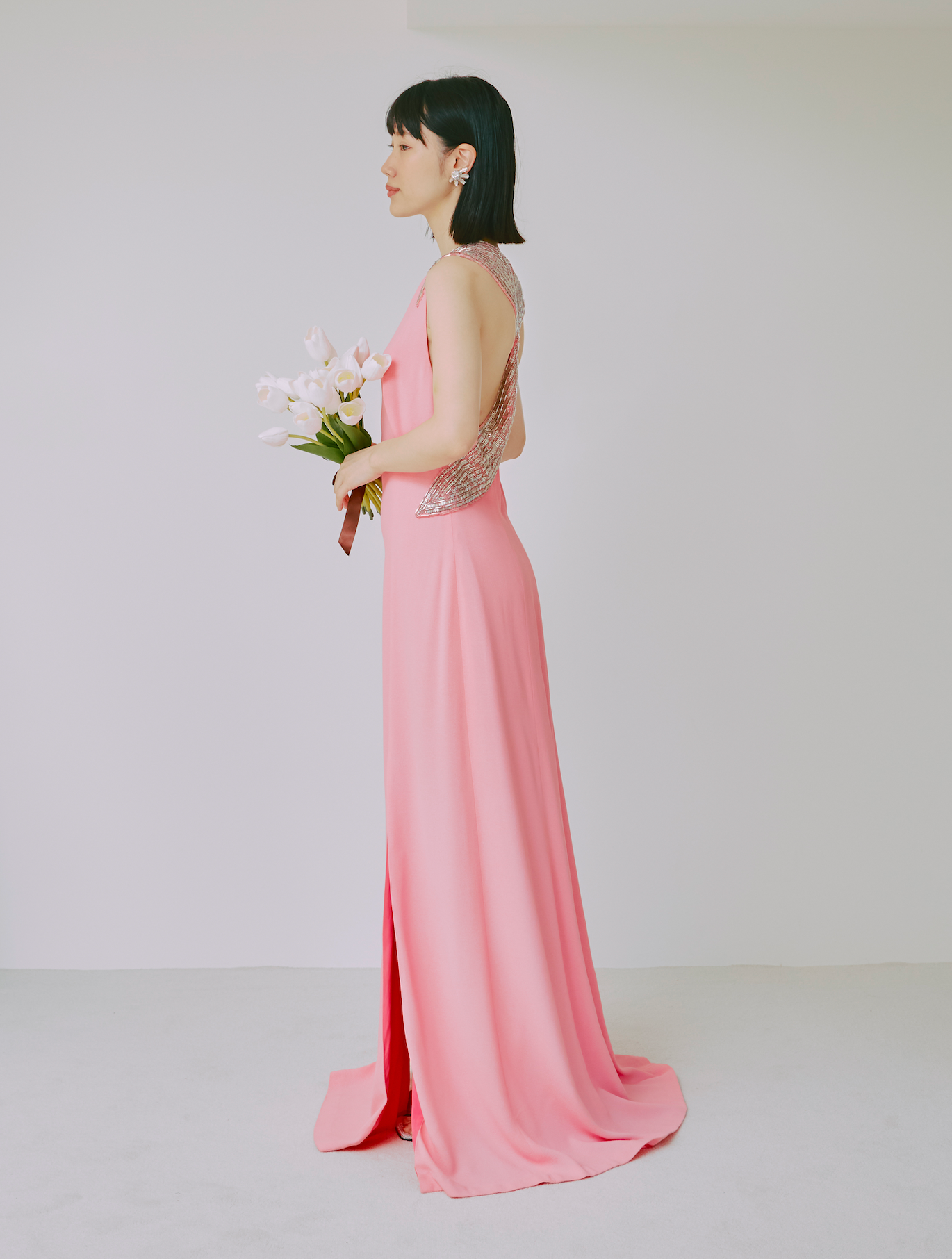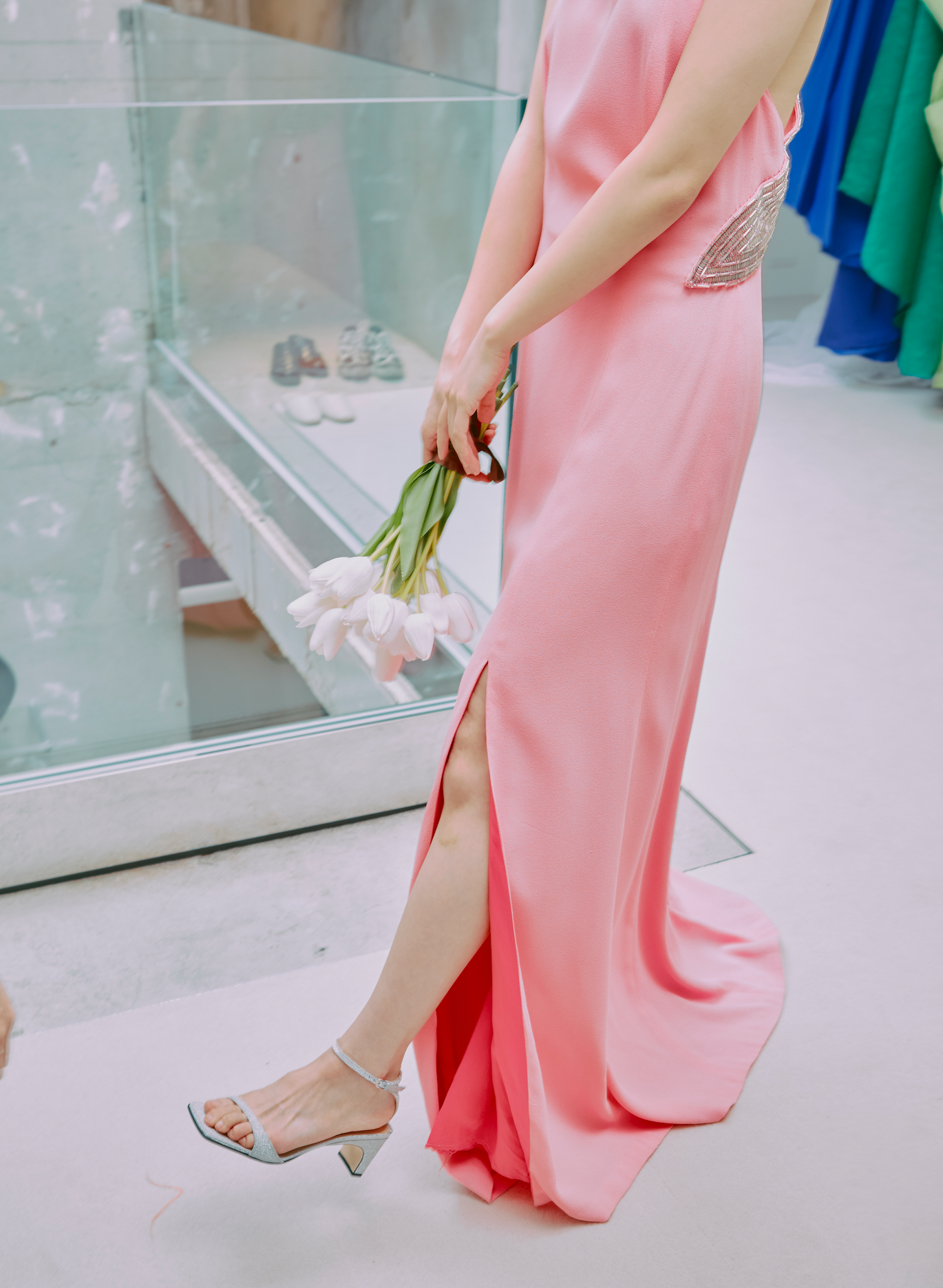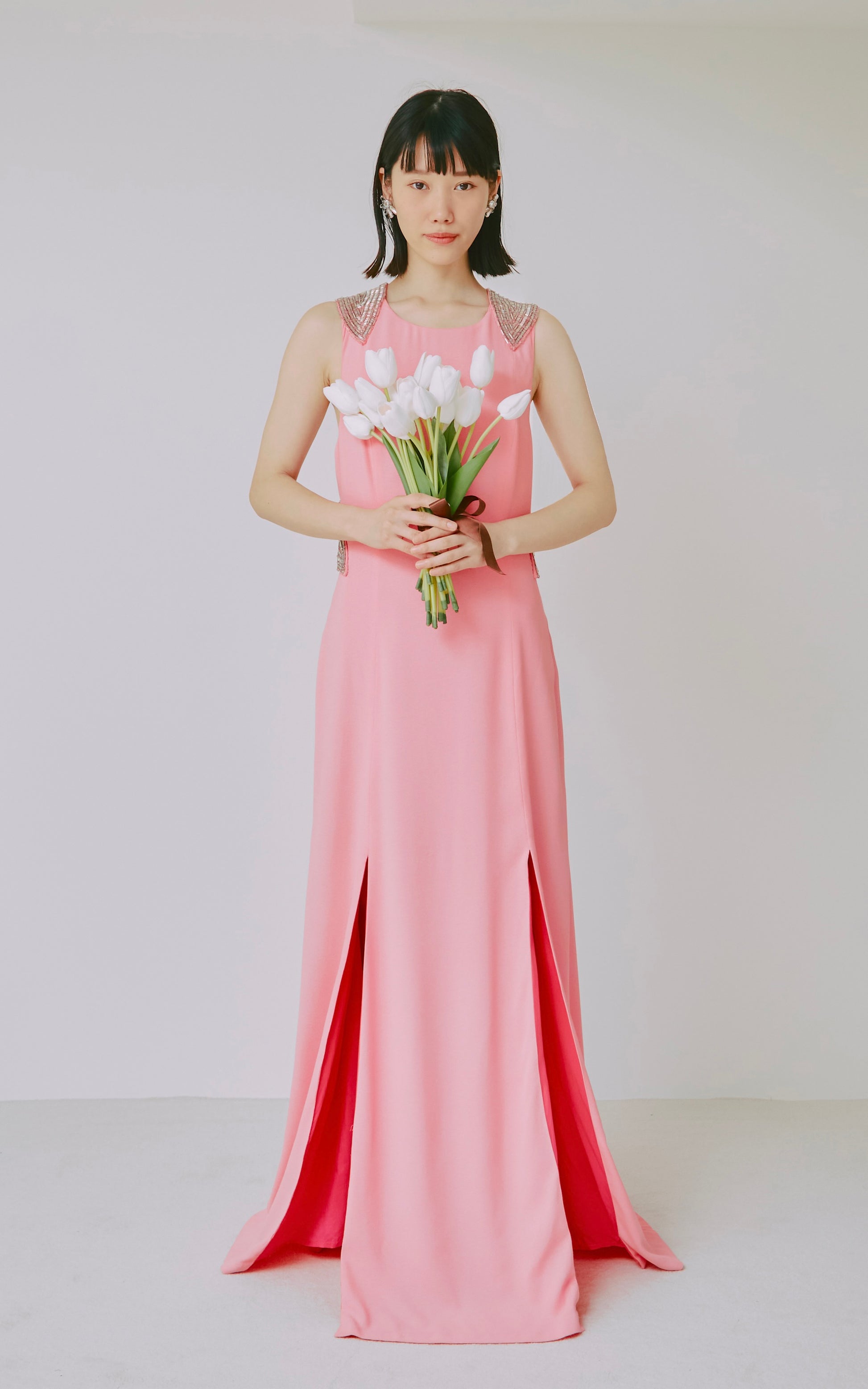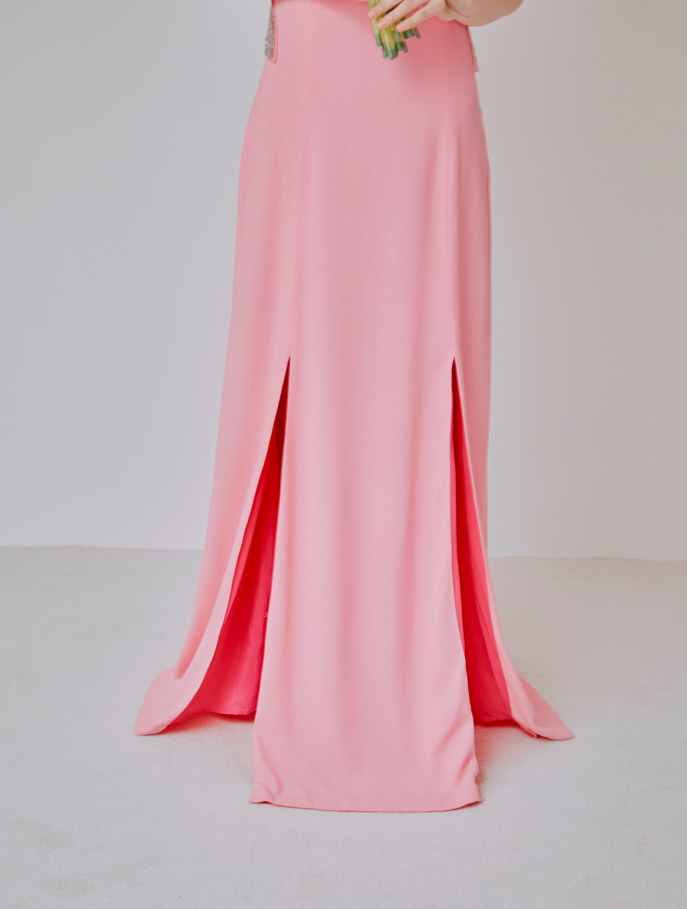 The dark pink peeking through the edgy slit creates a fashionable look.