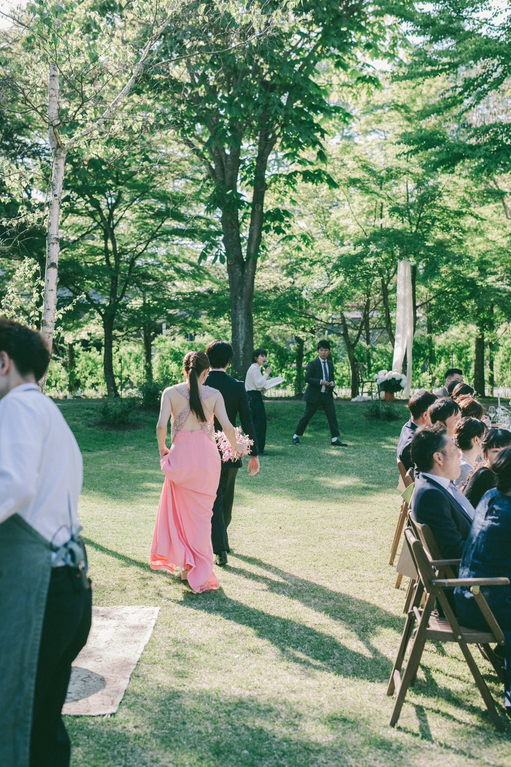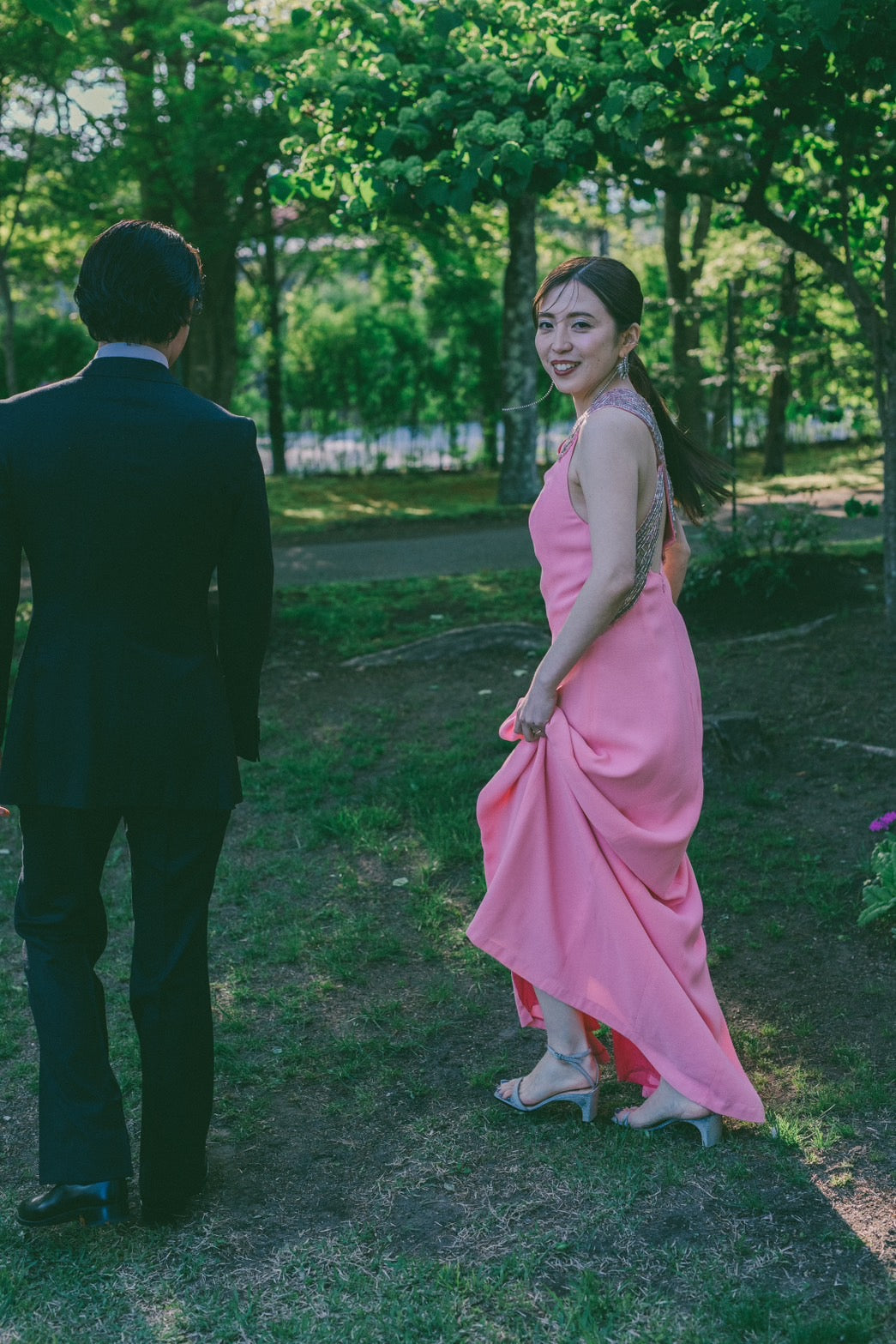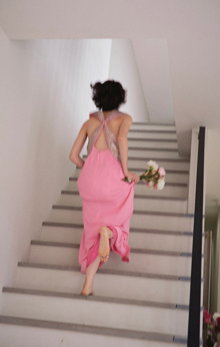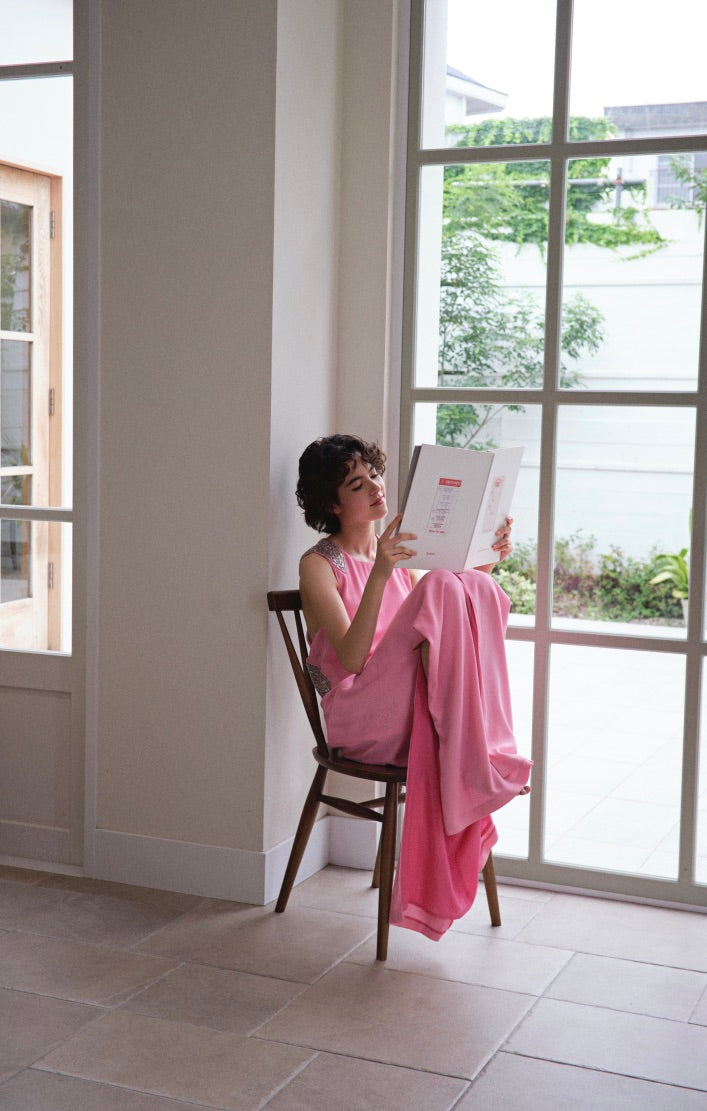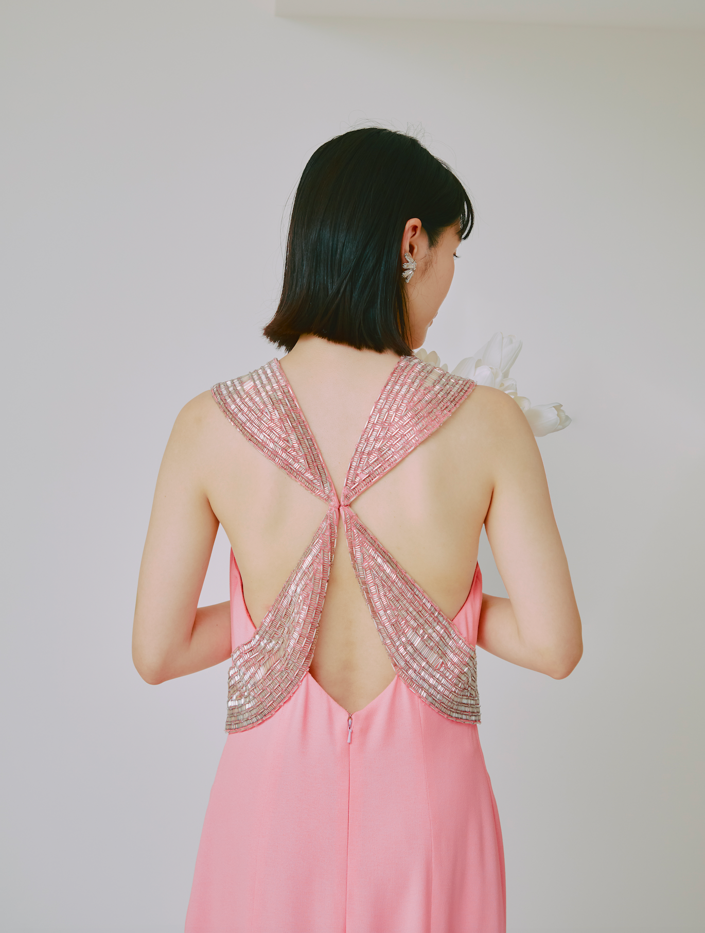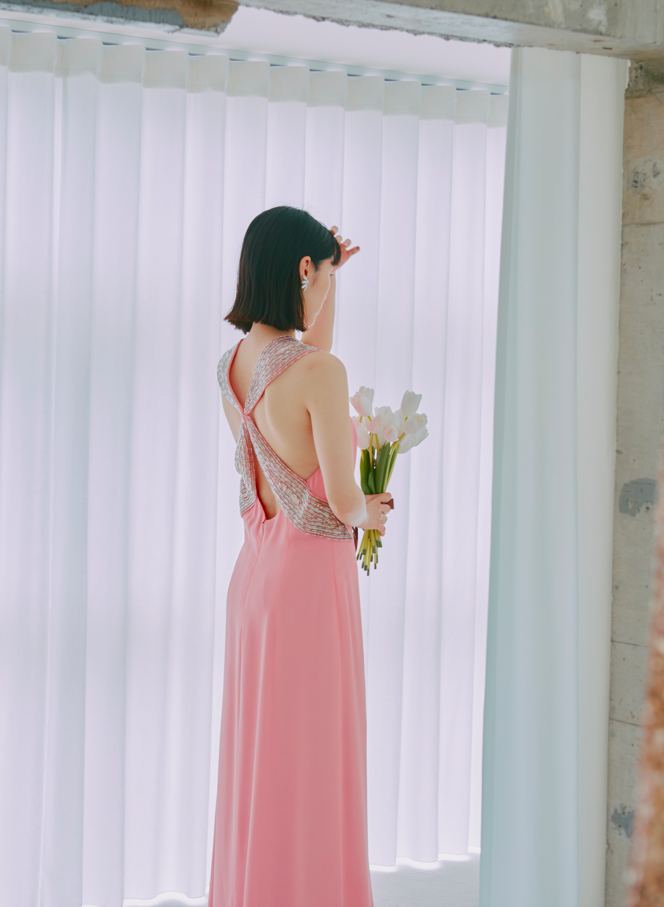 The dark pink peeking through the edgy slit creates a fashionable look.