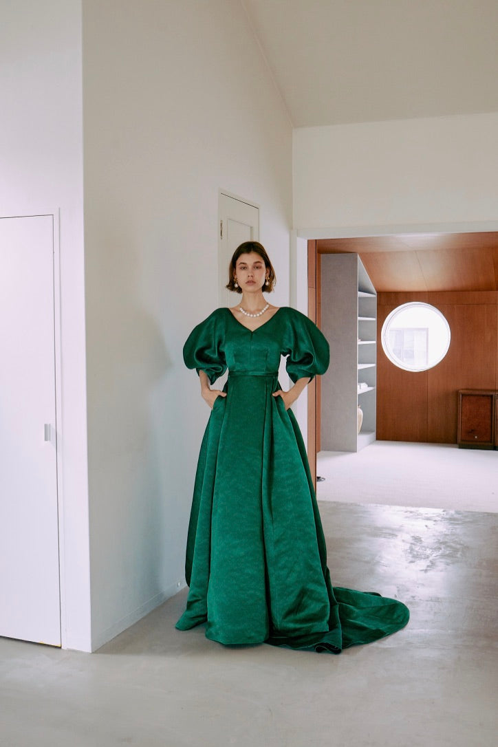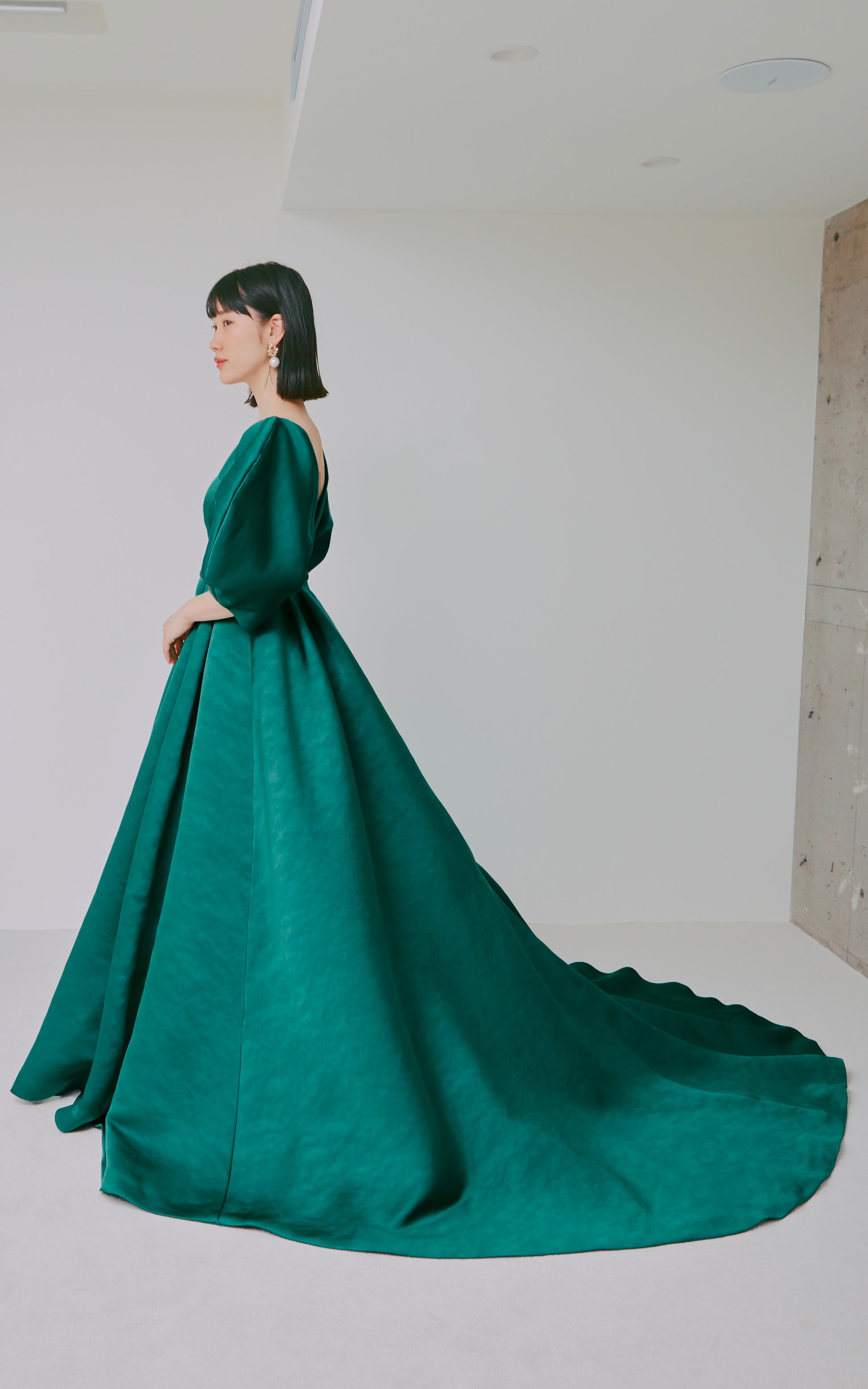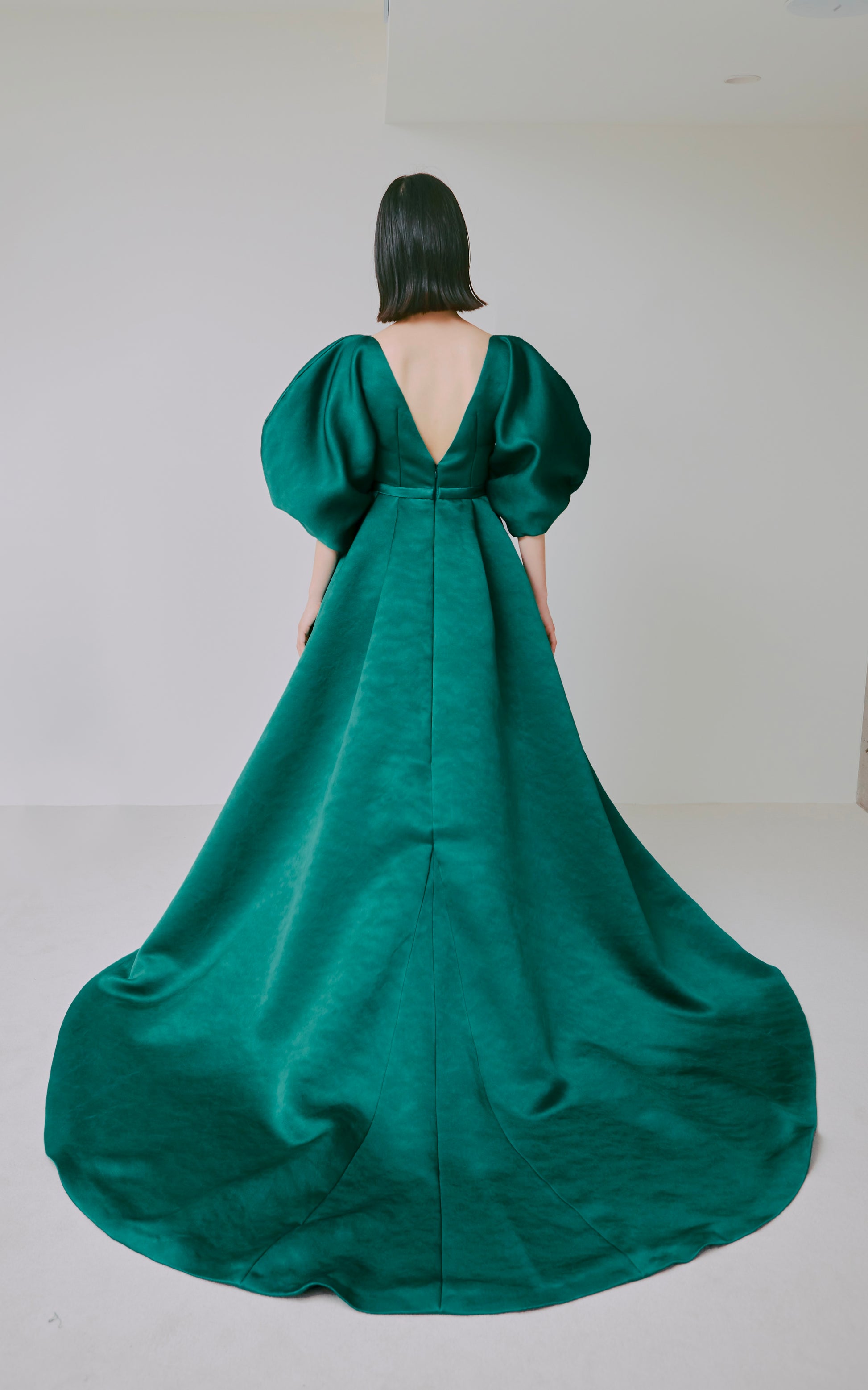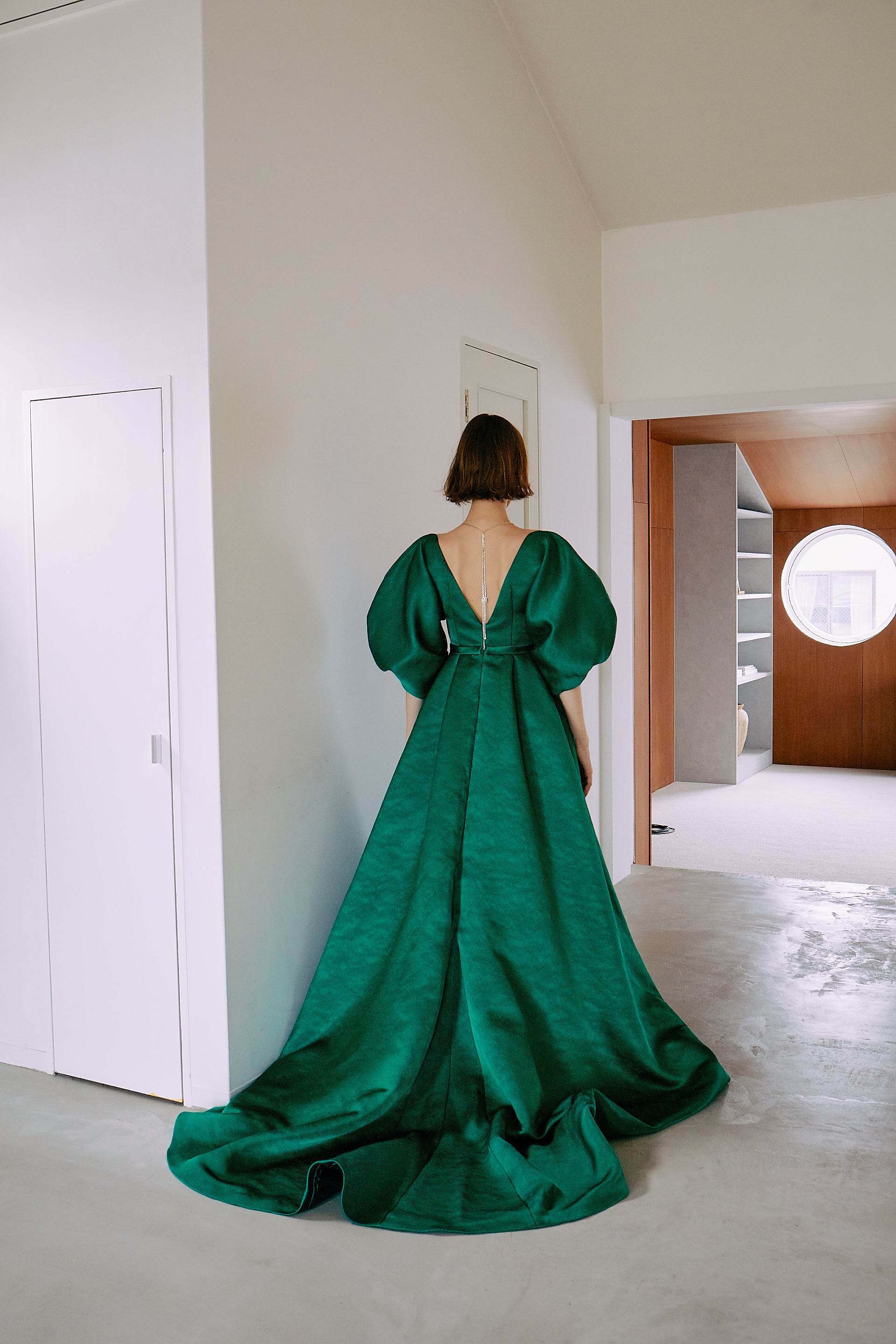 上質な光沢感が美しいイタリア製のシルクサテンを使用したグリーンドレス。