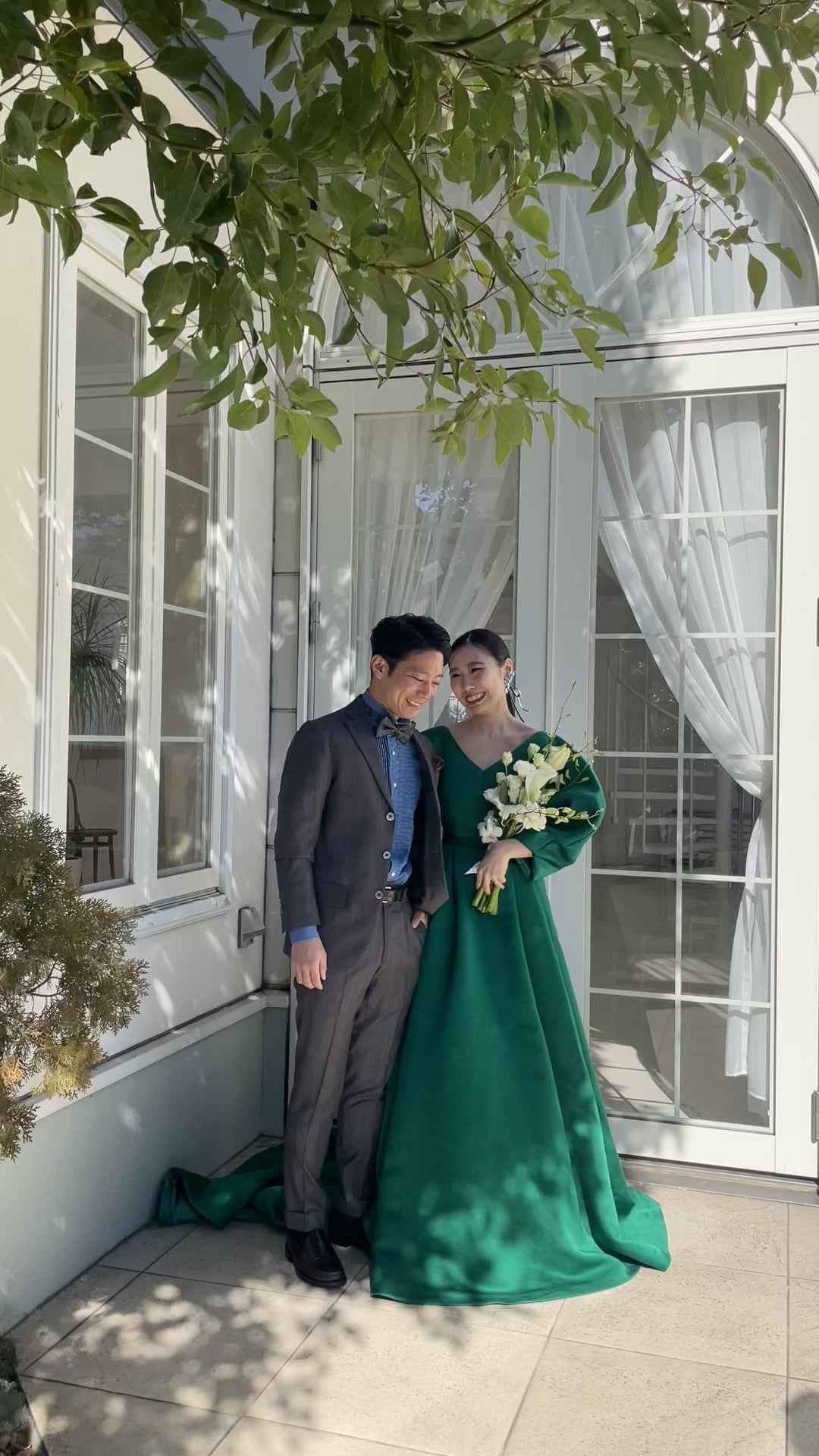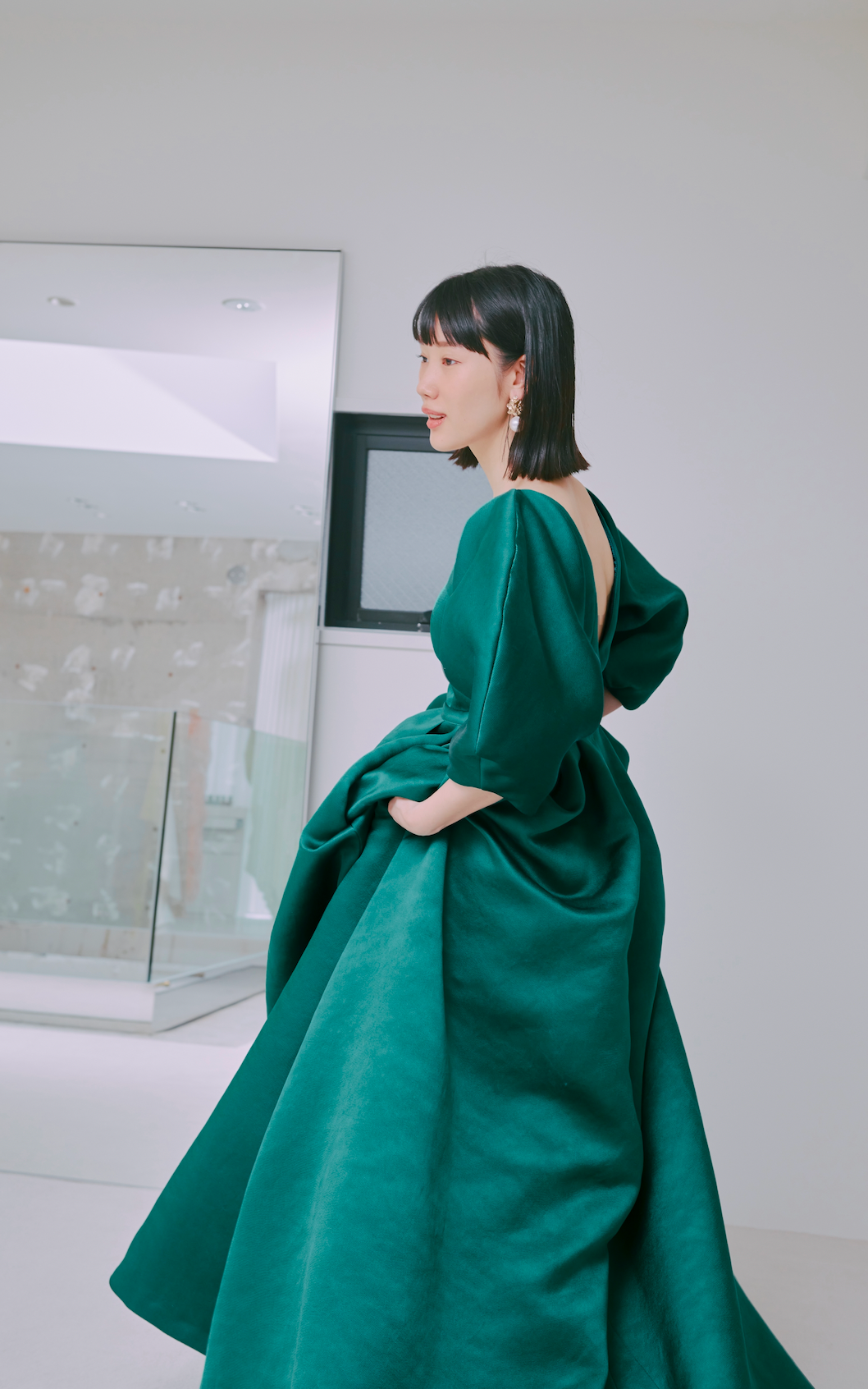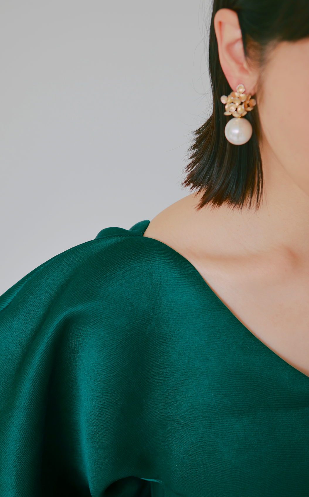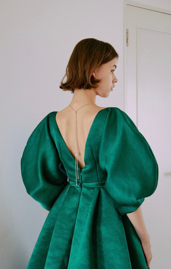 上質な光沢感が美しいイタリア製のシルクサテンを使用したグリーンドレス。