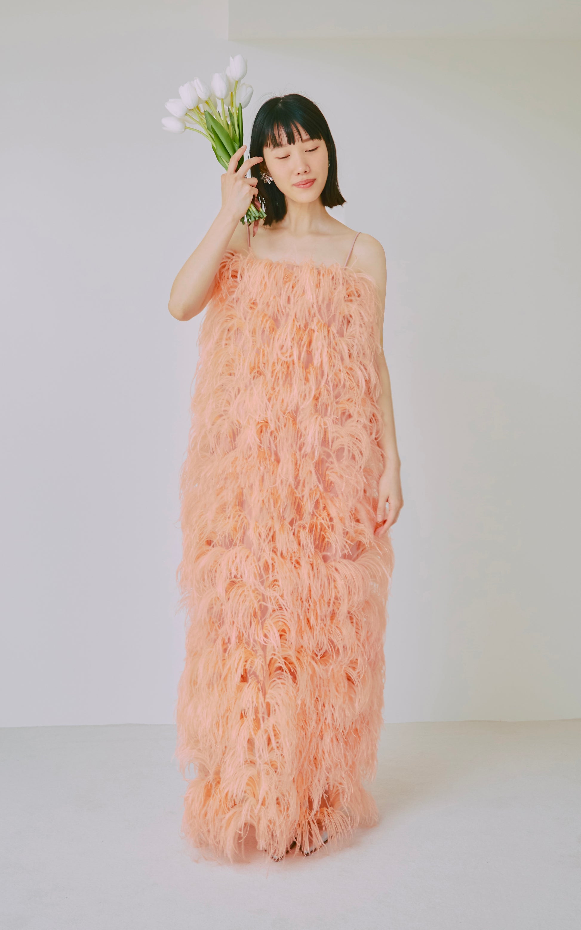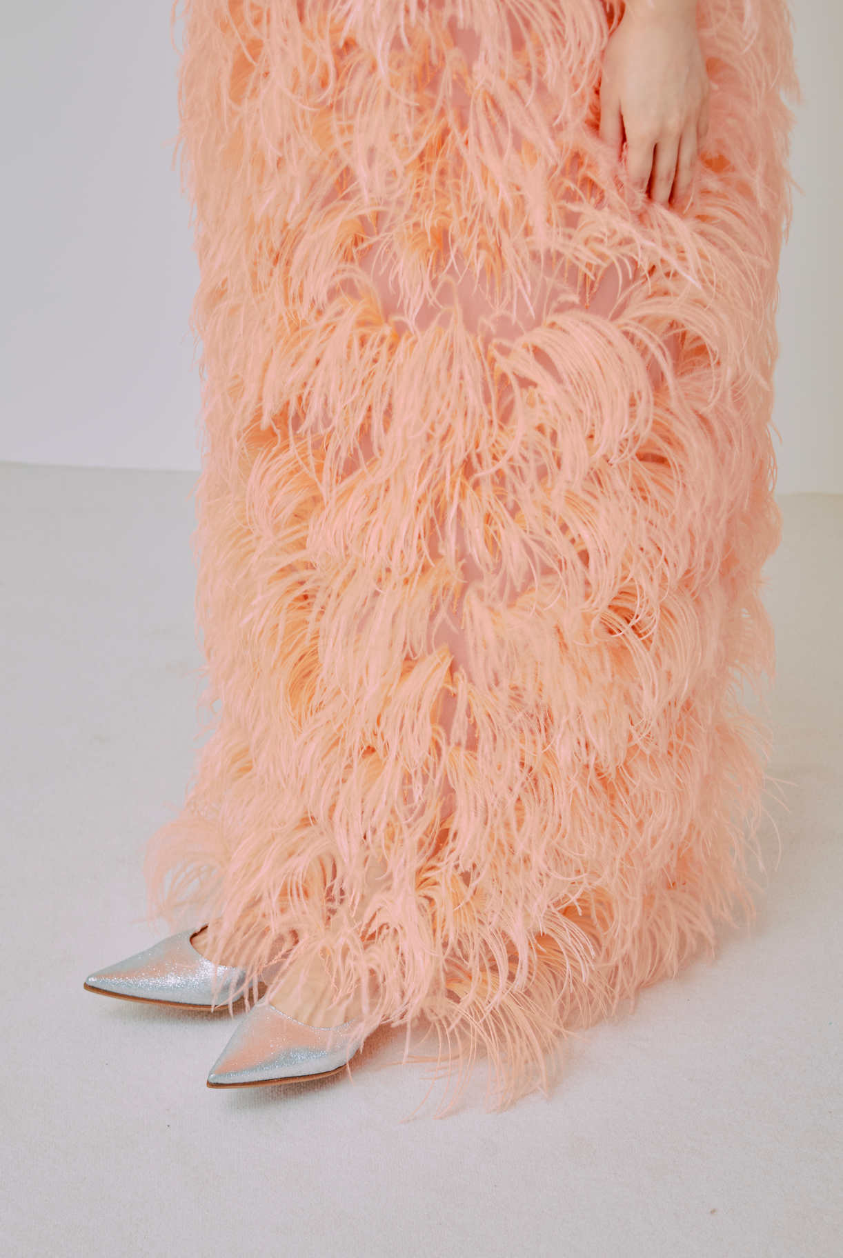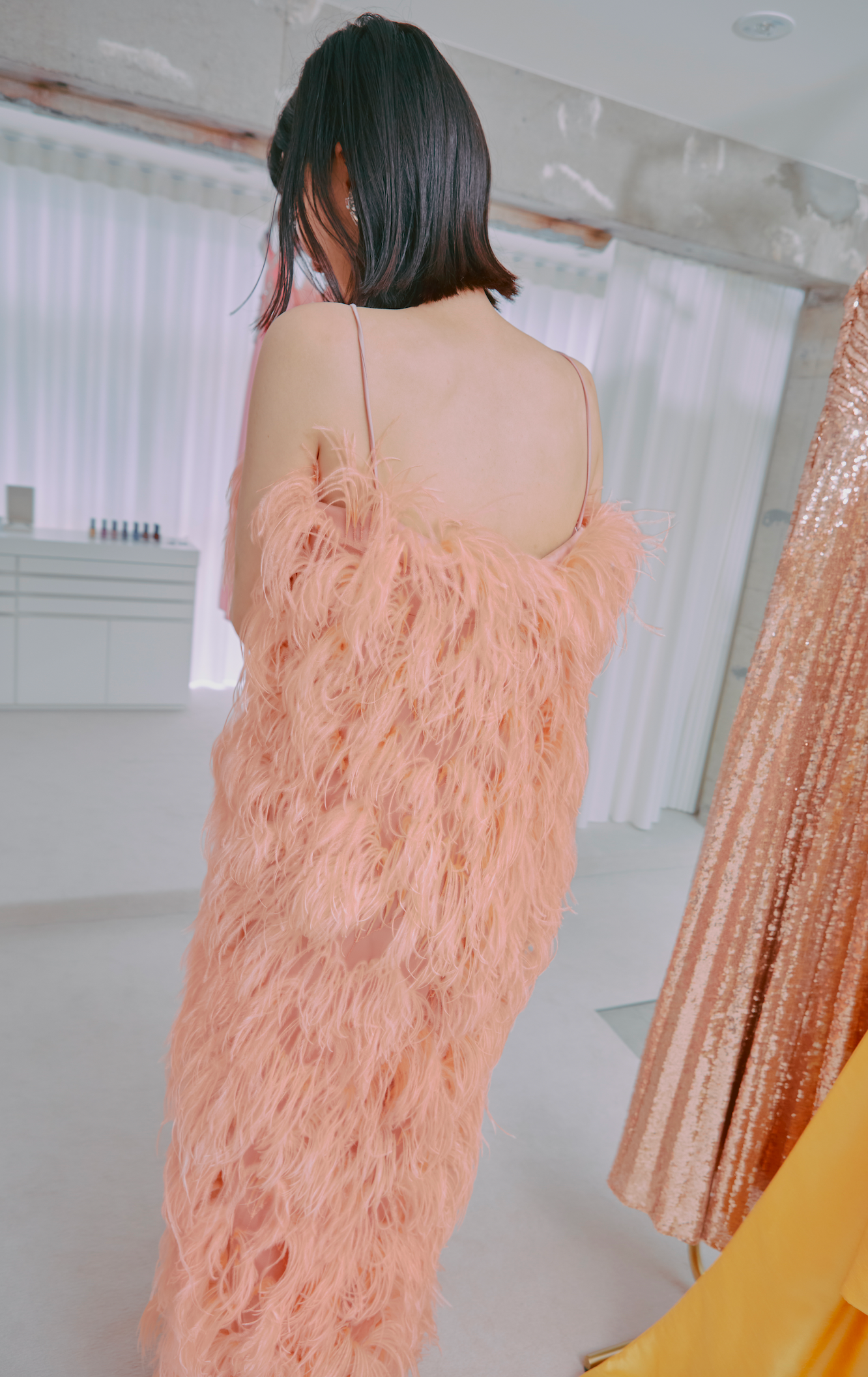 サーモンピンクのオーストリッチドレス。