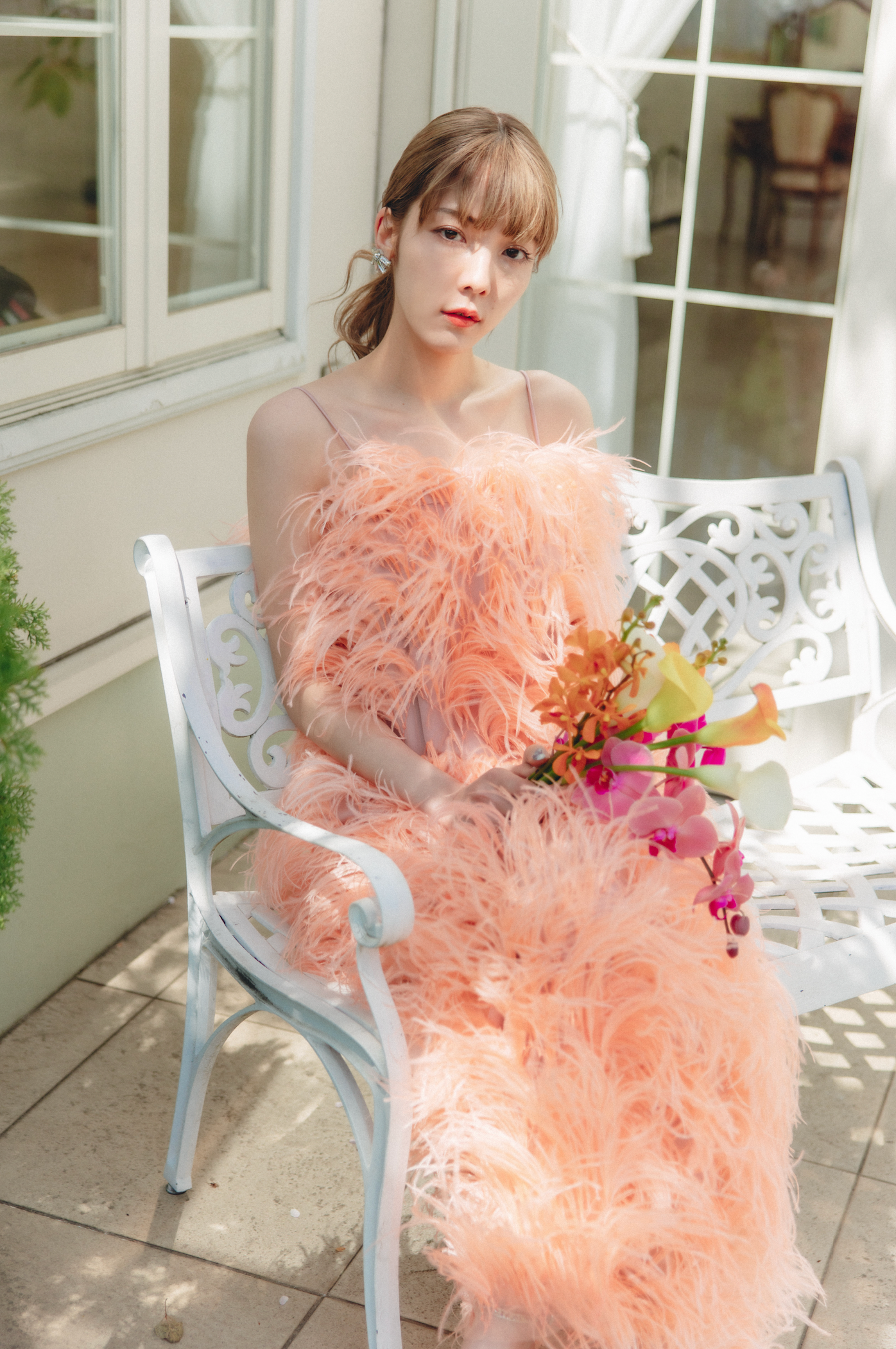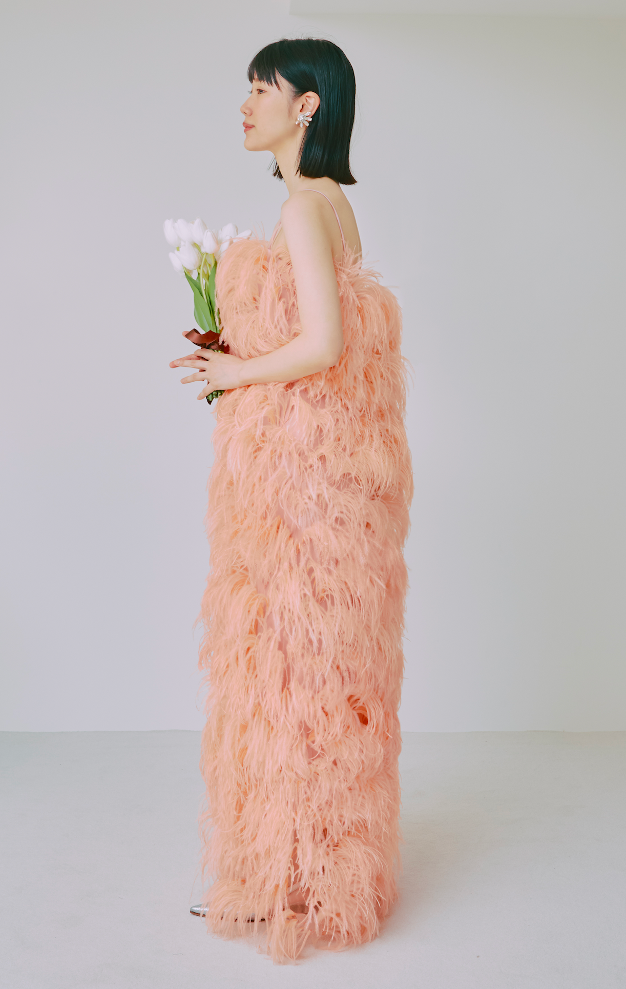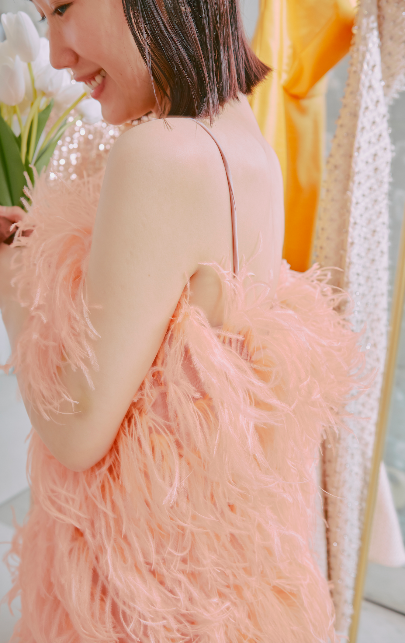 サーモンピンクのオーストリッチドレス。