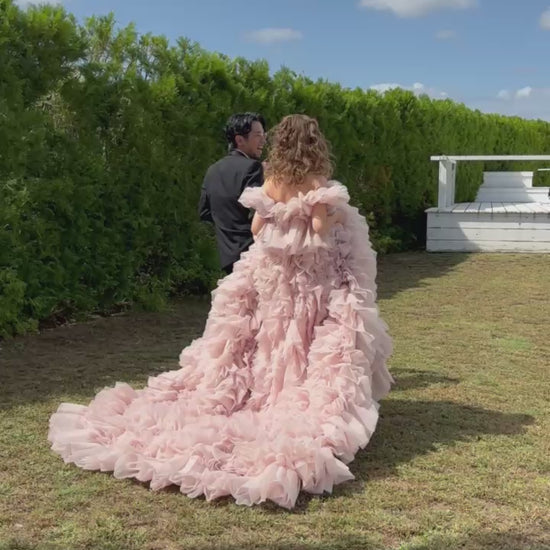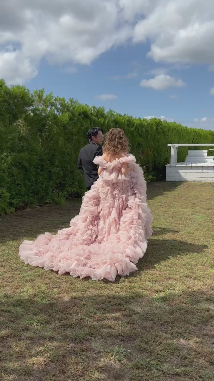 The dress, crafted from specially treated Japan-made organza fabric, features bold, dramatic frills that exude elegance and strength. It's voluminous silhouette makes it an impactful choice, perfect for grand venues with high ceilings or luxurious hotels. Available in sizes 7 to 9.