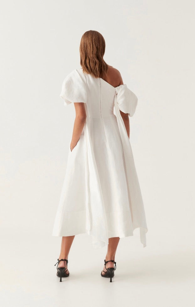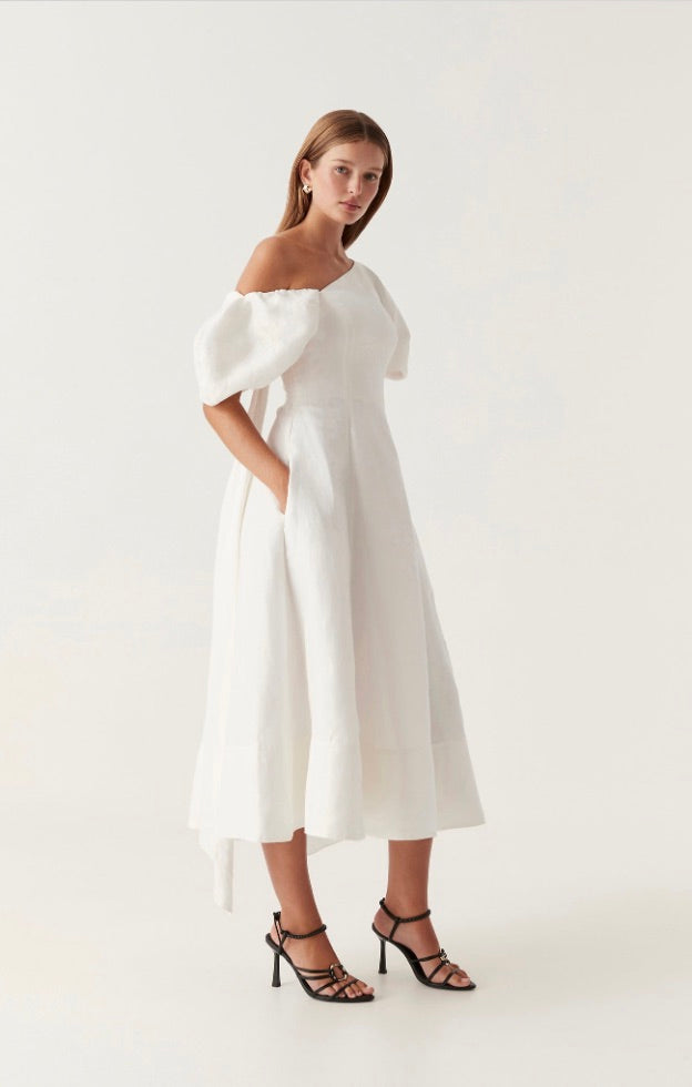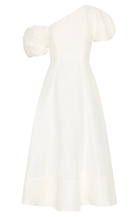 ふんわりとしたパフスリーブの袖とウエストにフィットしたシルエットが美しいドレス。