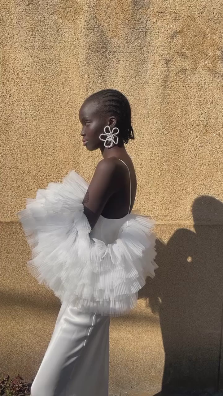 A vision of elegance, this dress features delicate, slender straps paired with voluminous pleated tulle, enhancing its sense of refined drama. The combination of airy tulle and intricate detailing makes this piece a statement of both sophistication and uniqueness, ideal for elevating any special occasion or party look.