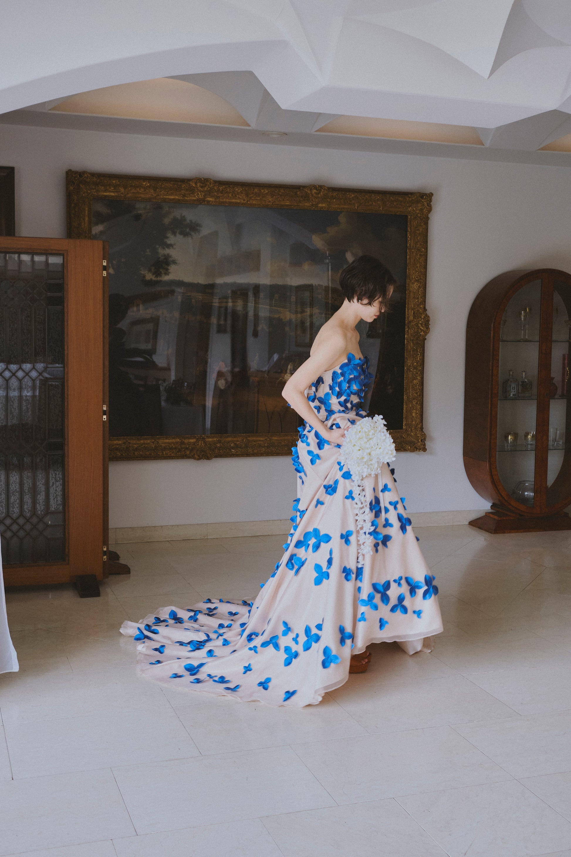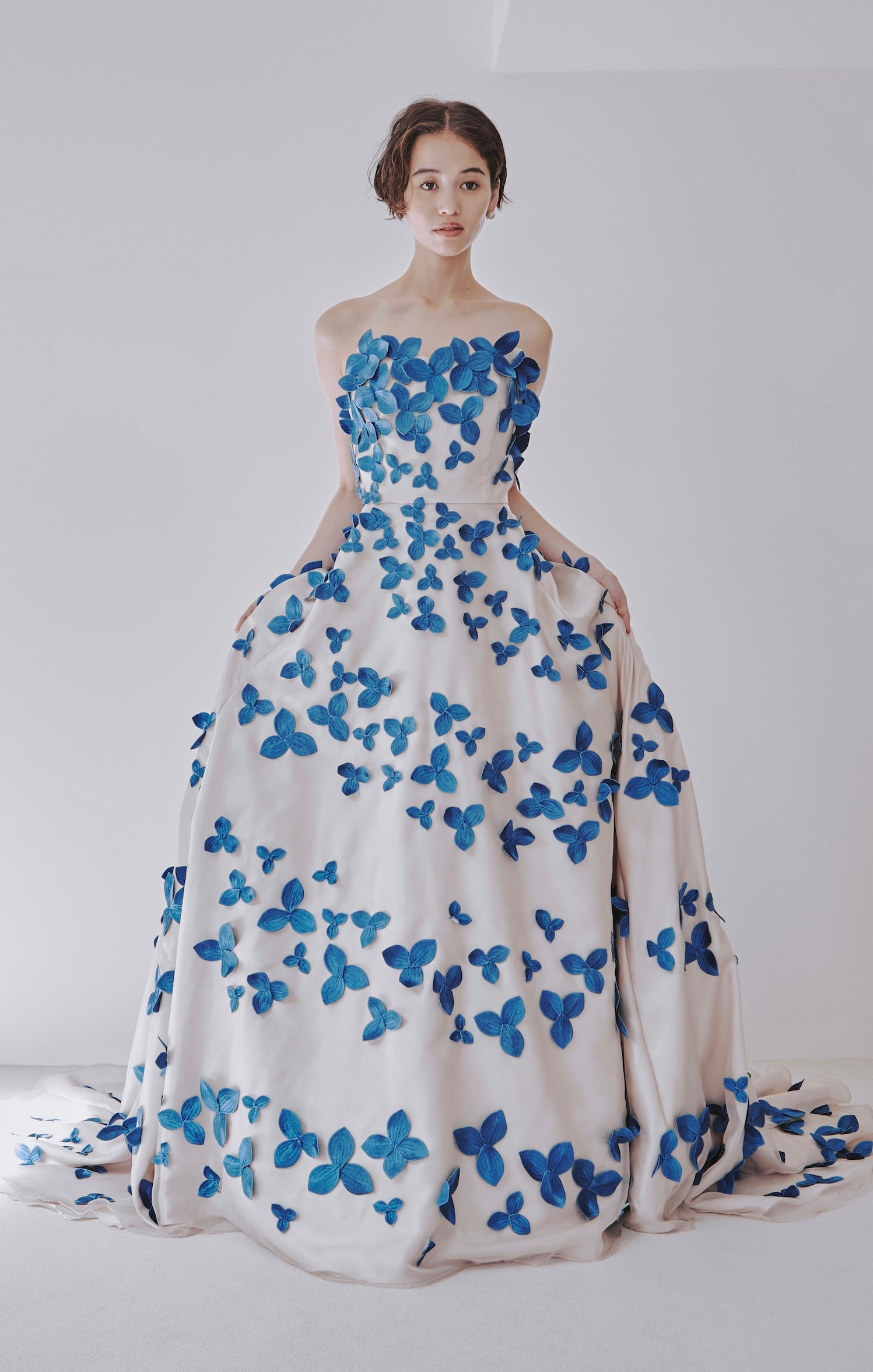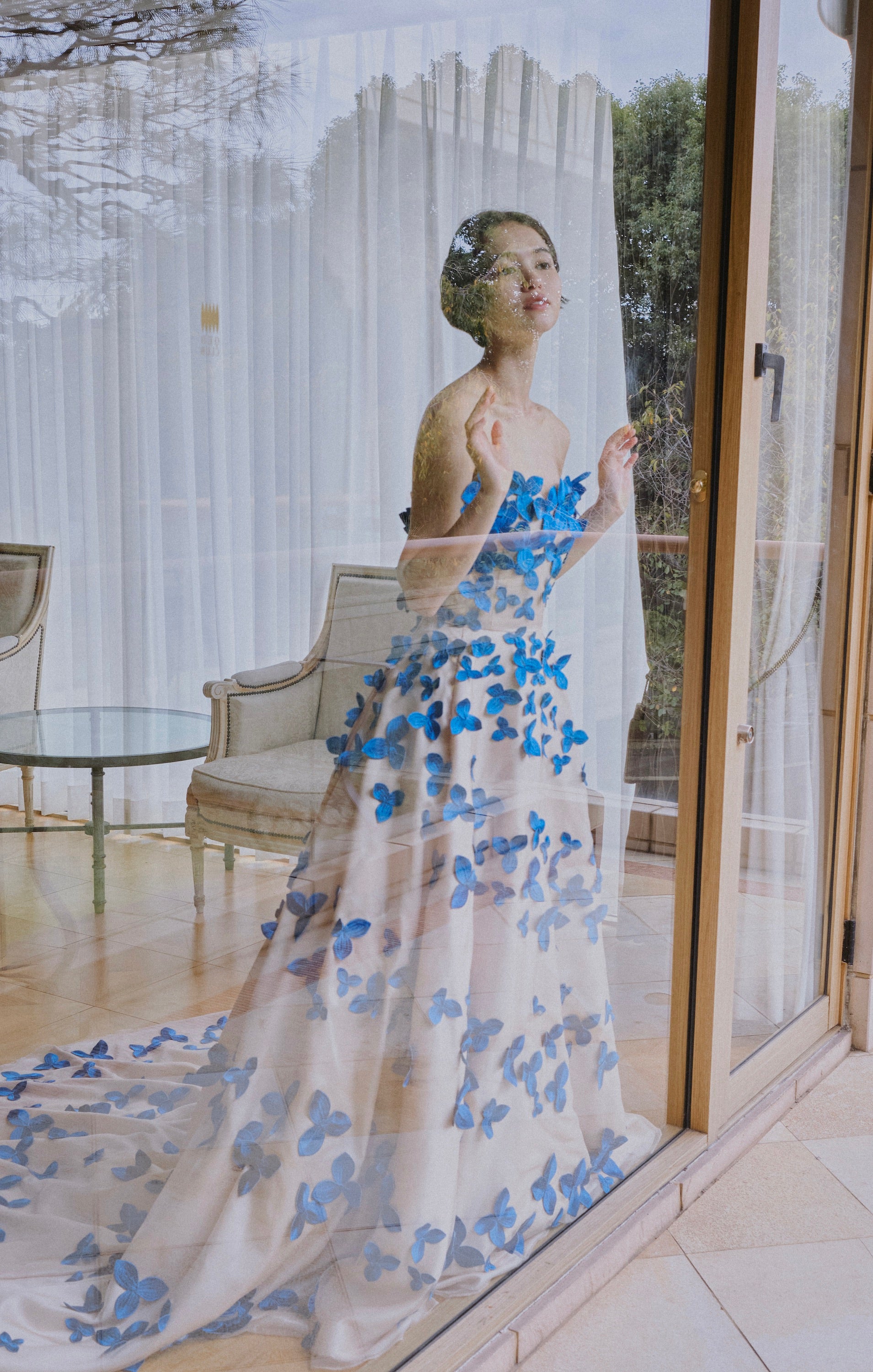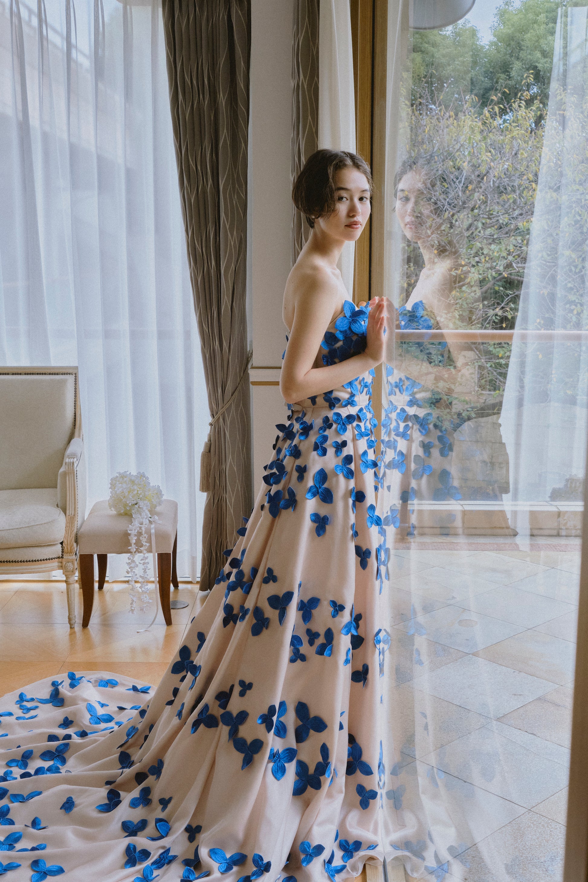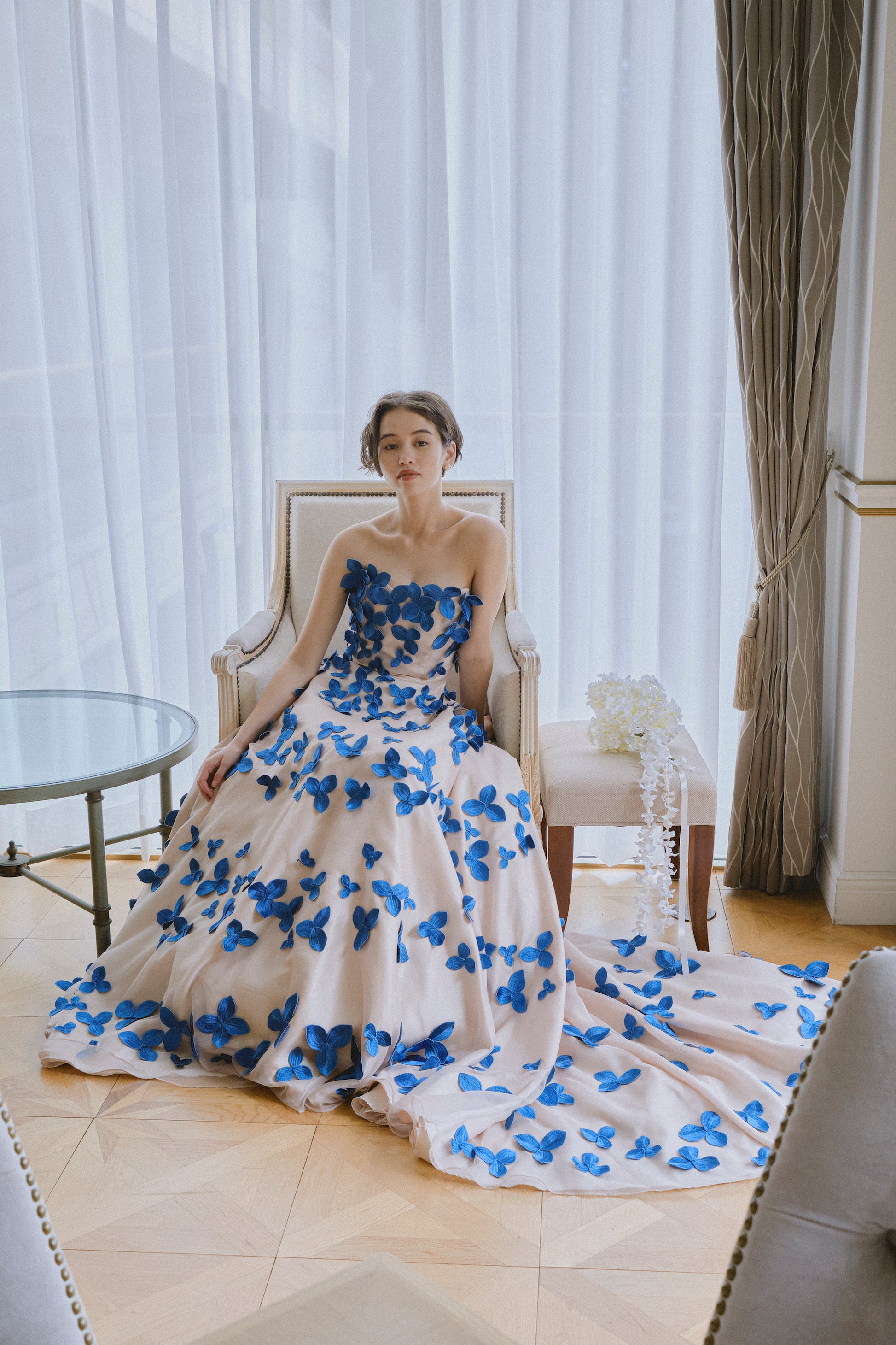 An exquisitely embroidered gown in sizes 7 to 11, featuring intricate blue detailing over a soft beige base. The elegant A-line silhouette gently contours the body, while the graceful, refined train elevates the overall design. The subtle harmony of the beige and striking blue accents adds a luminous, polished finish to the look, perfect for those seeking timeless sophistication.
