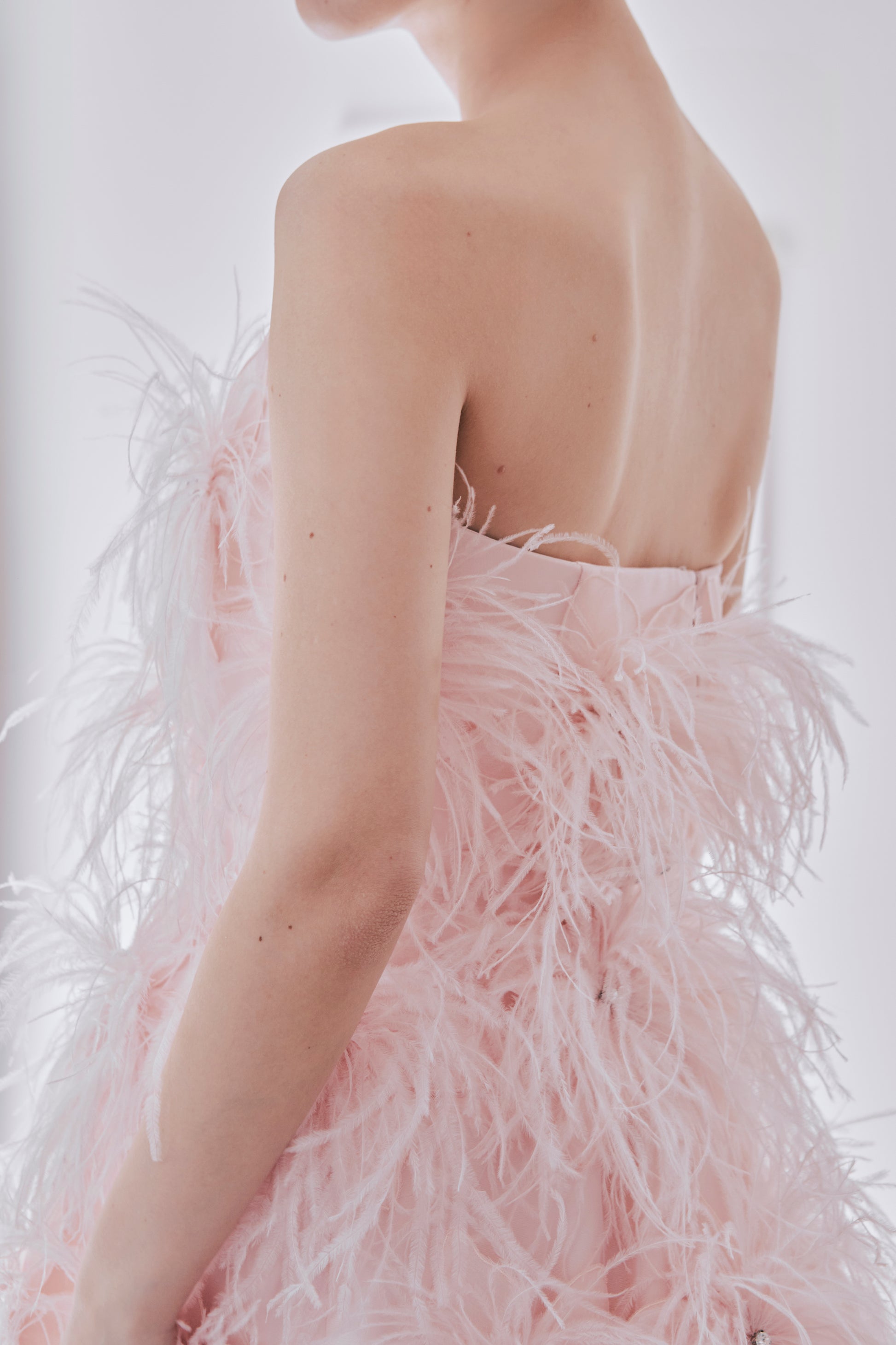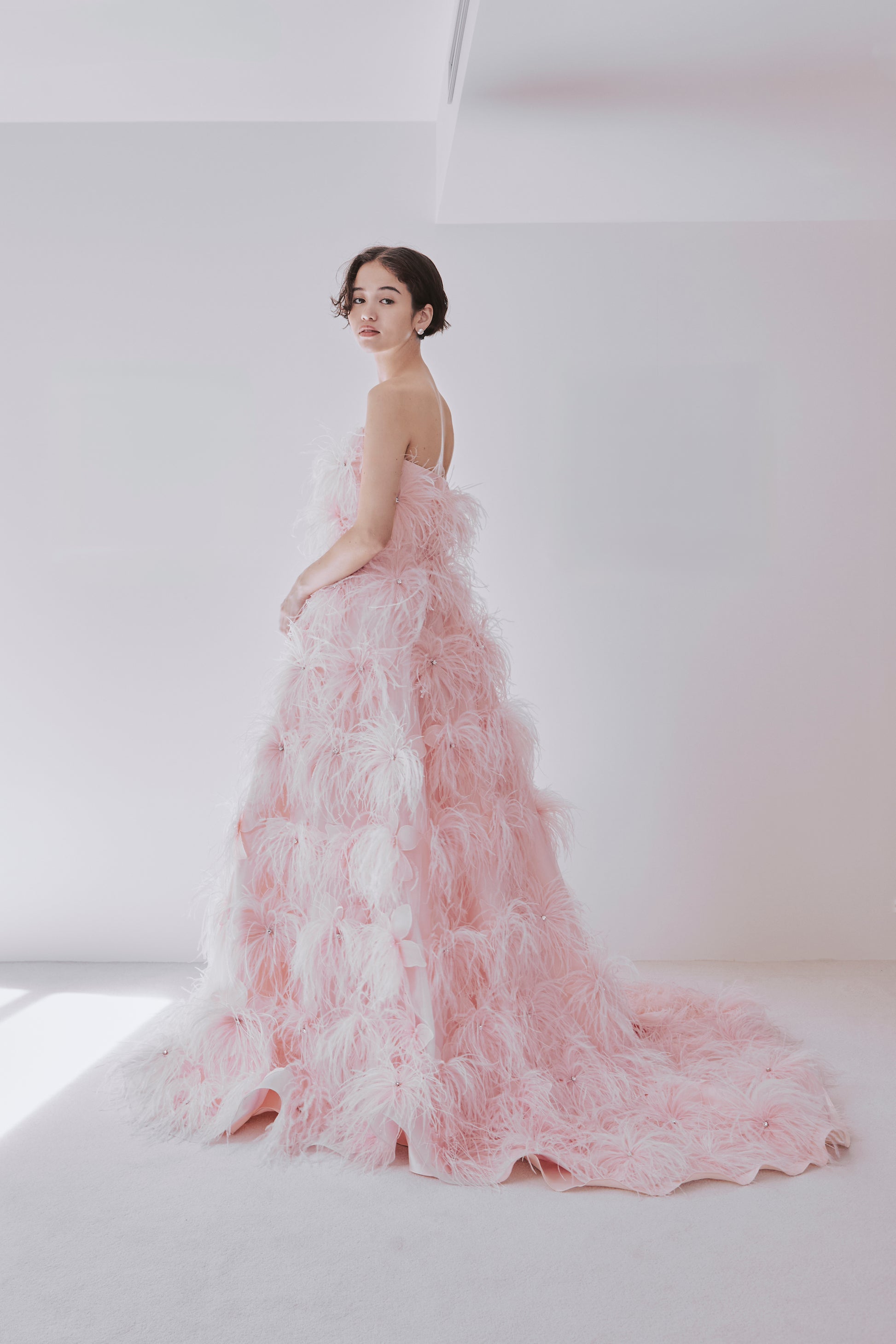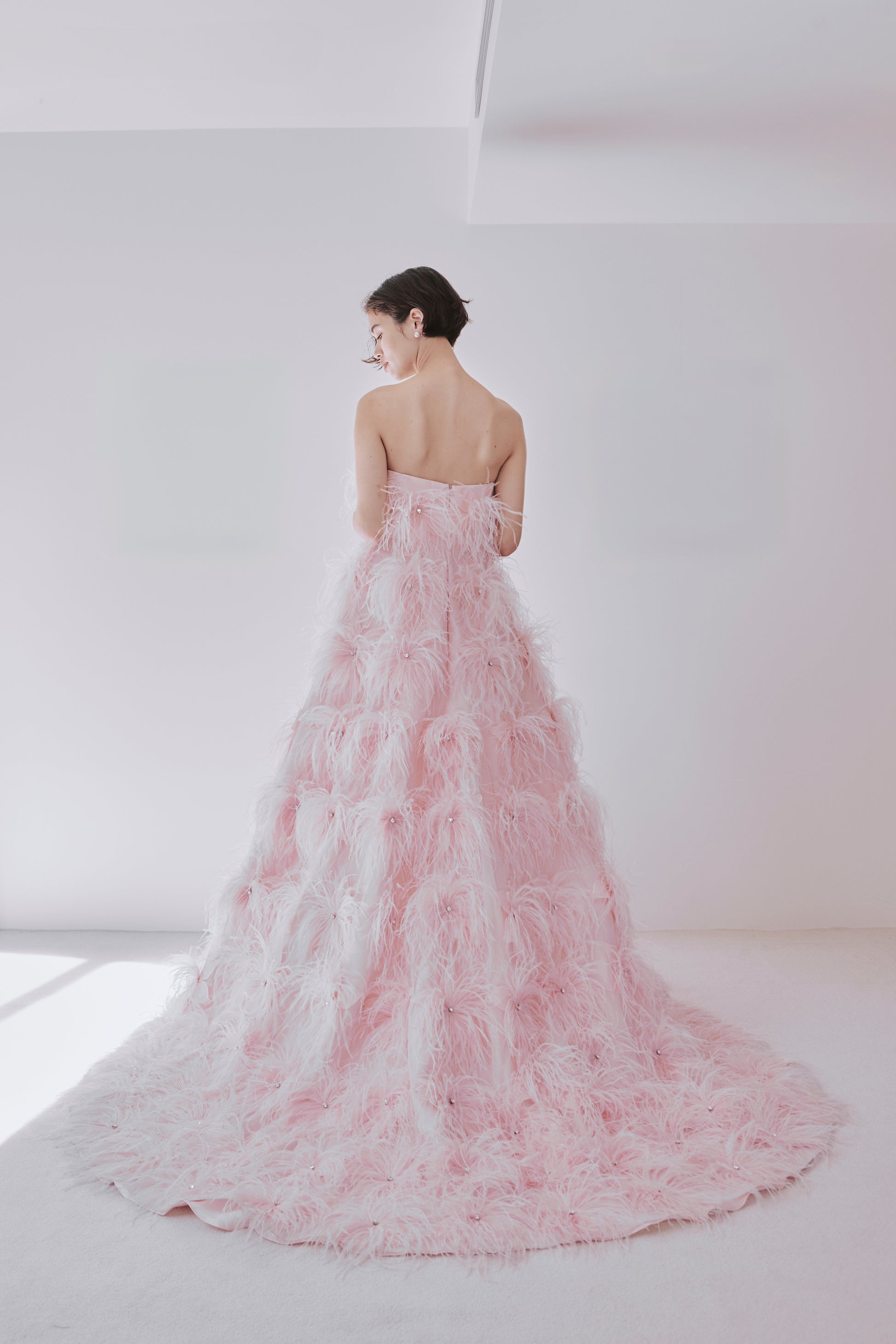 ドレスに合わせて染めた青みピンクのオーストリッチが贅沢にデザインされた1着。