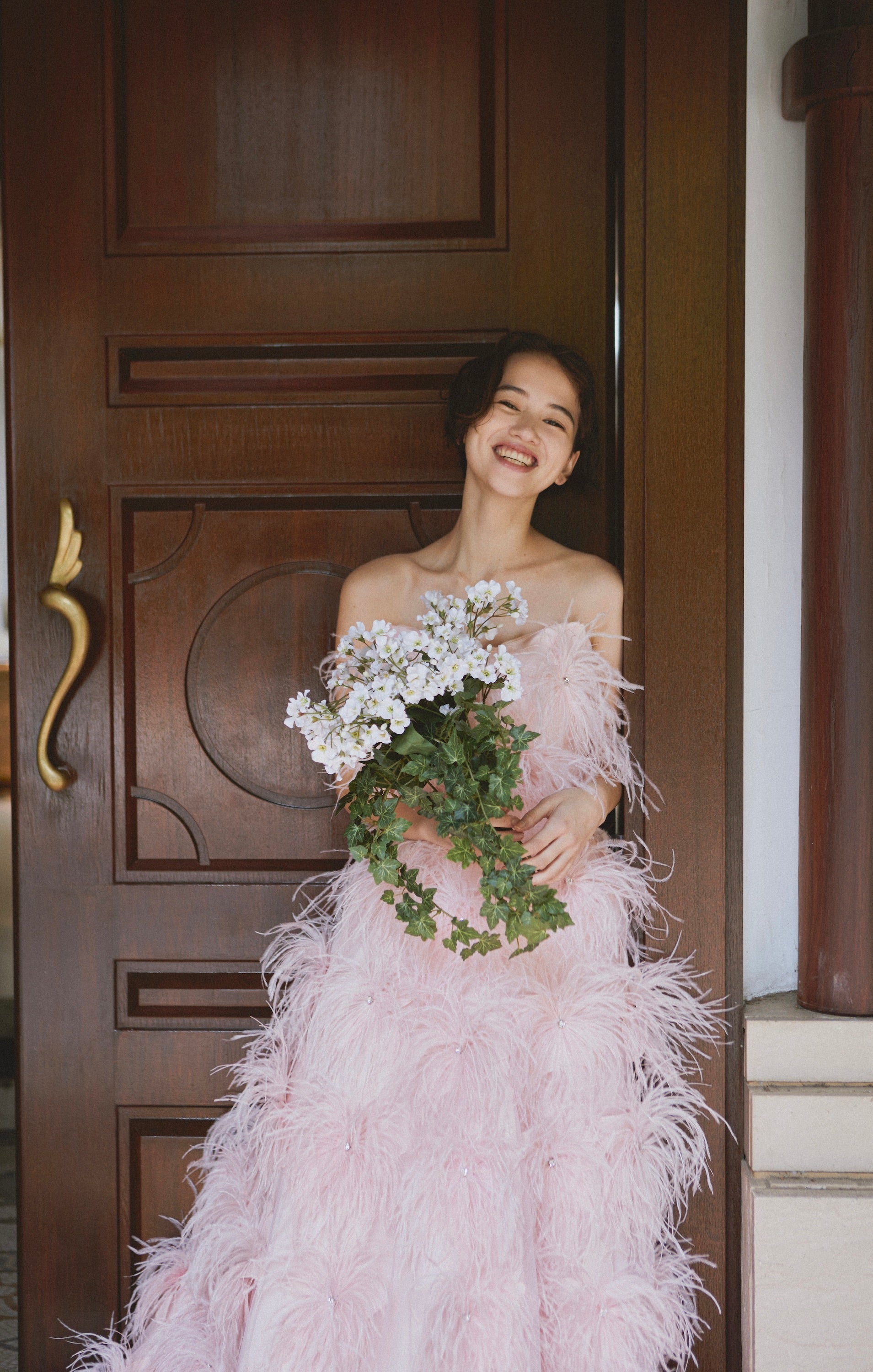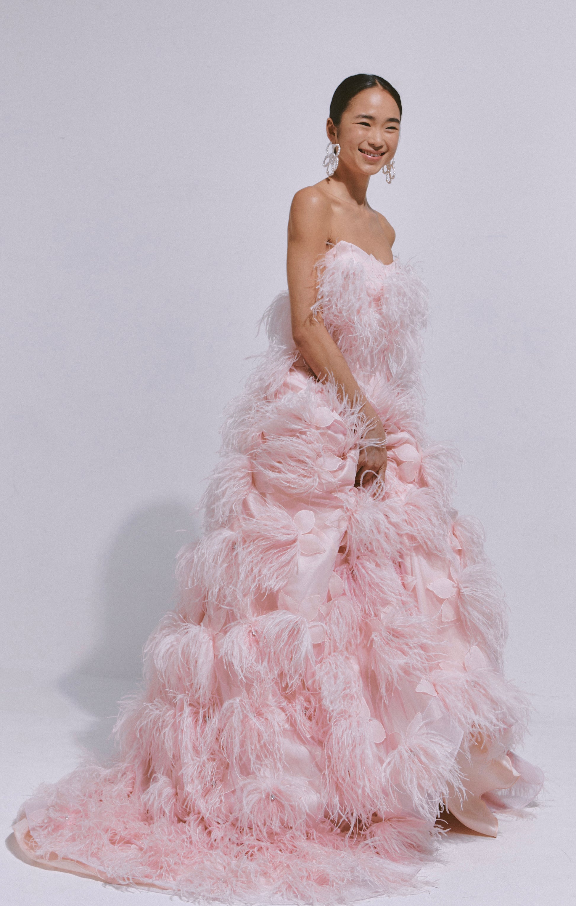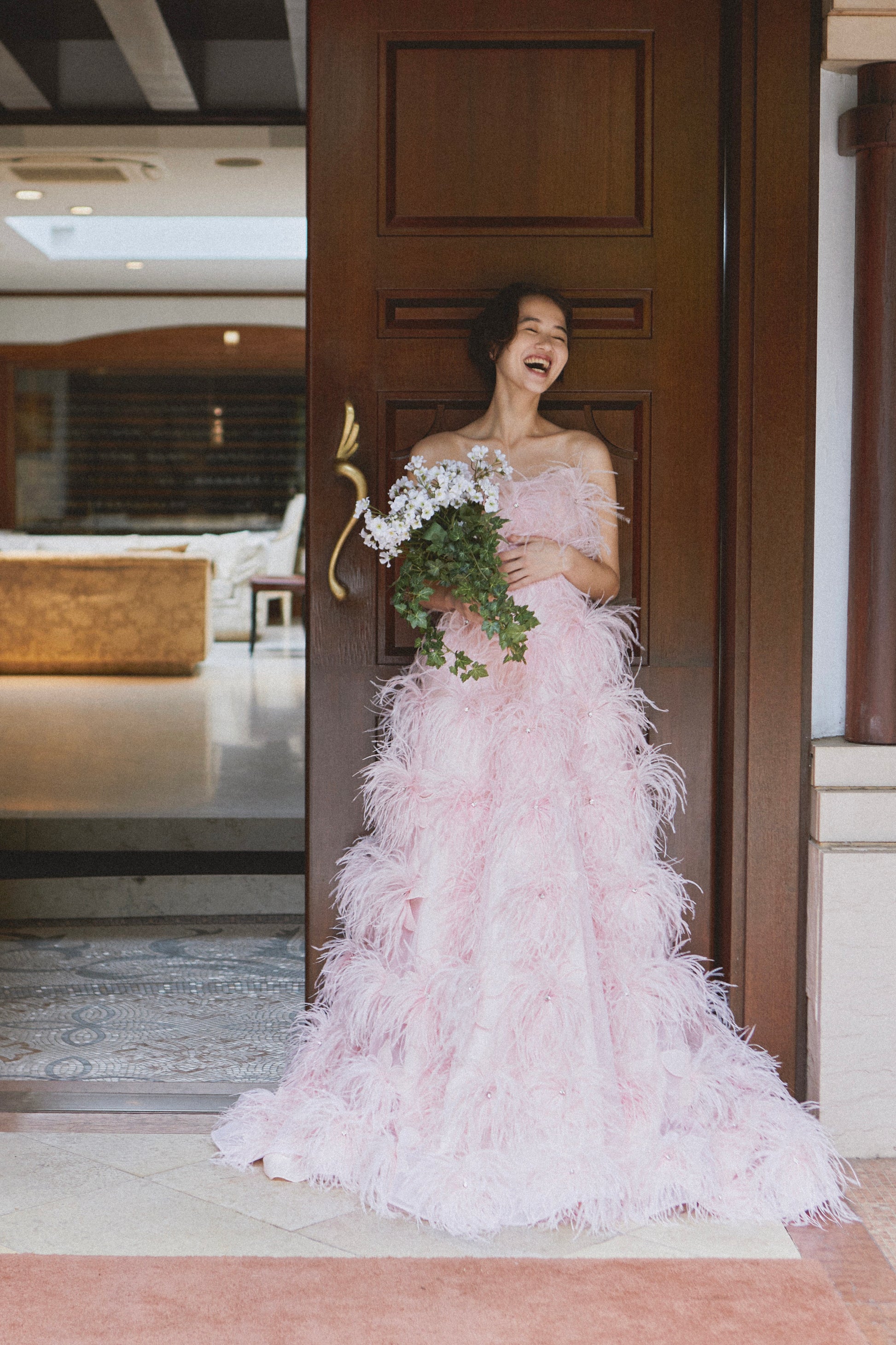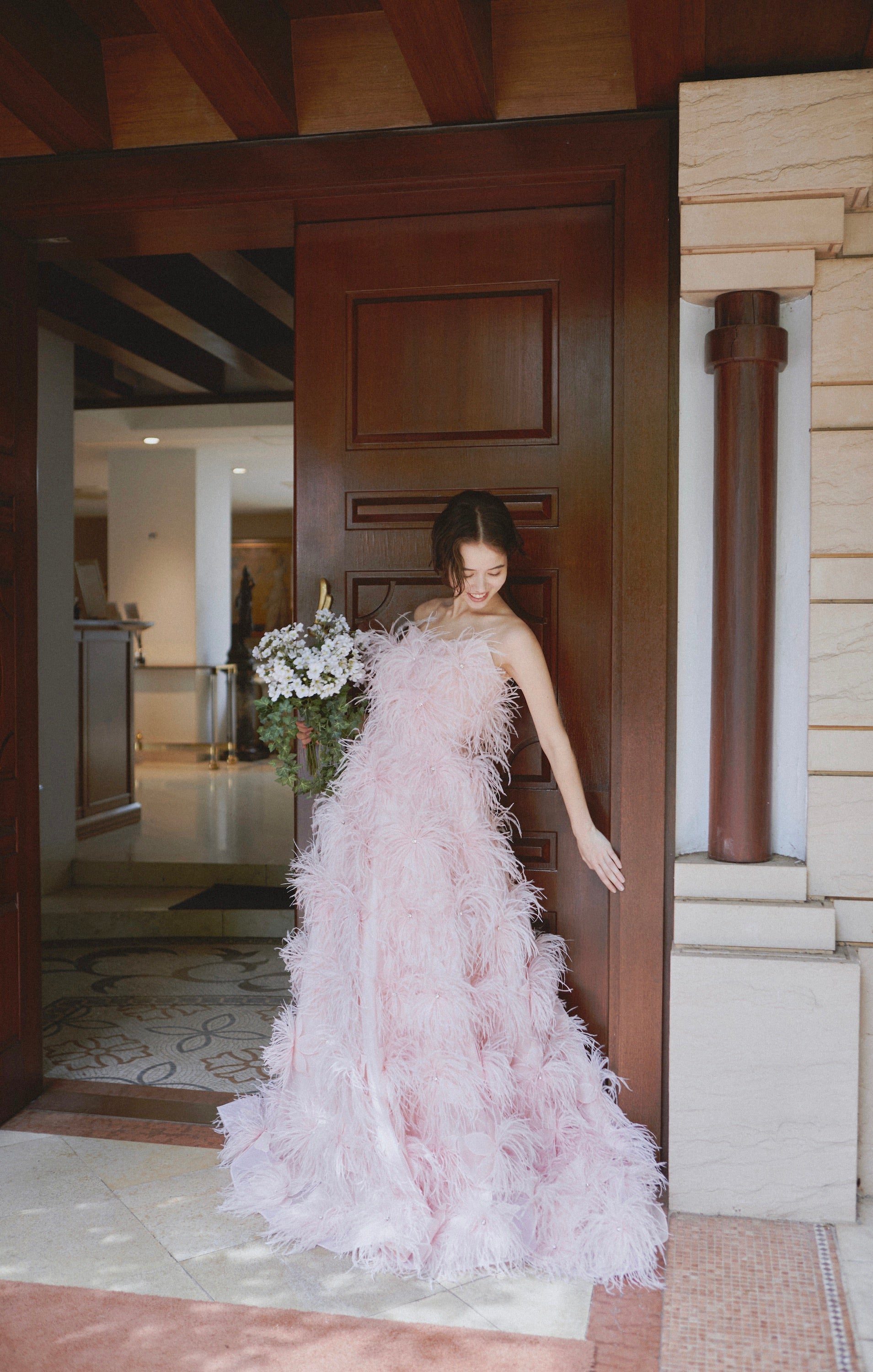 ドレスに合わせて染めた青みピンクのオーストリッチが贅沢にデザインされた1着。
