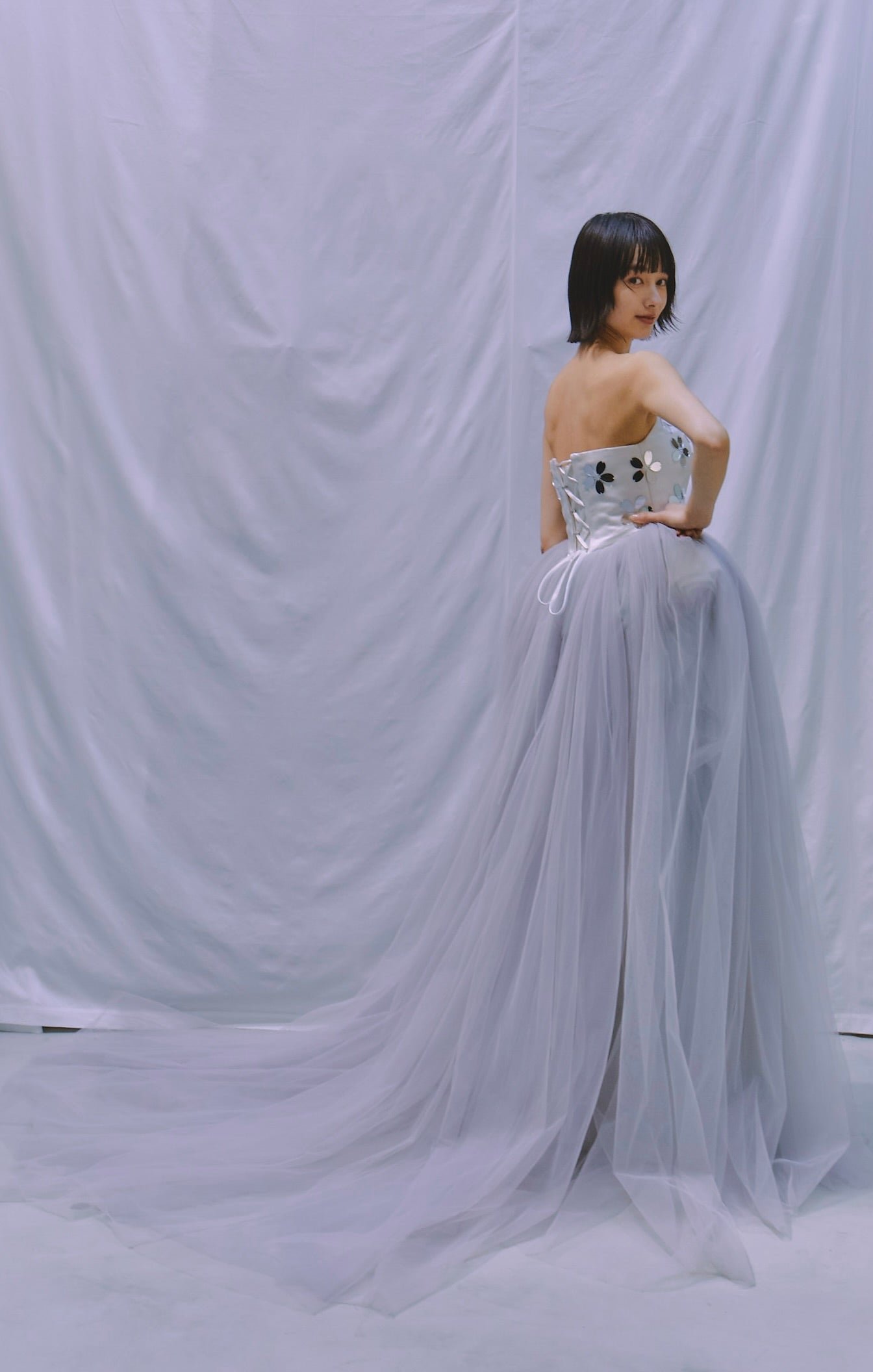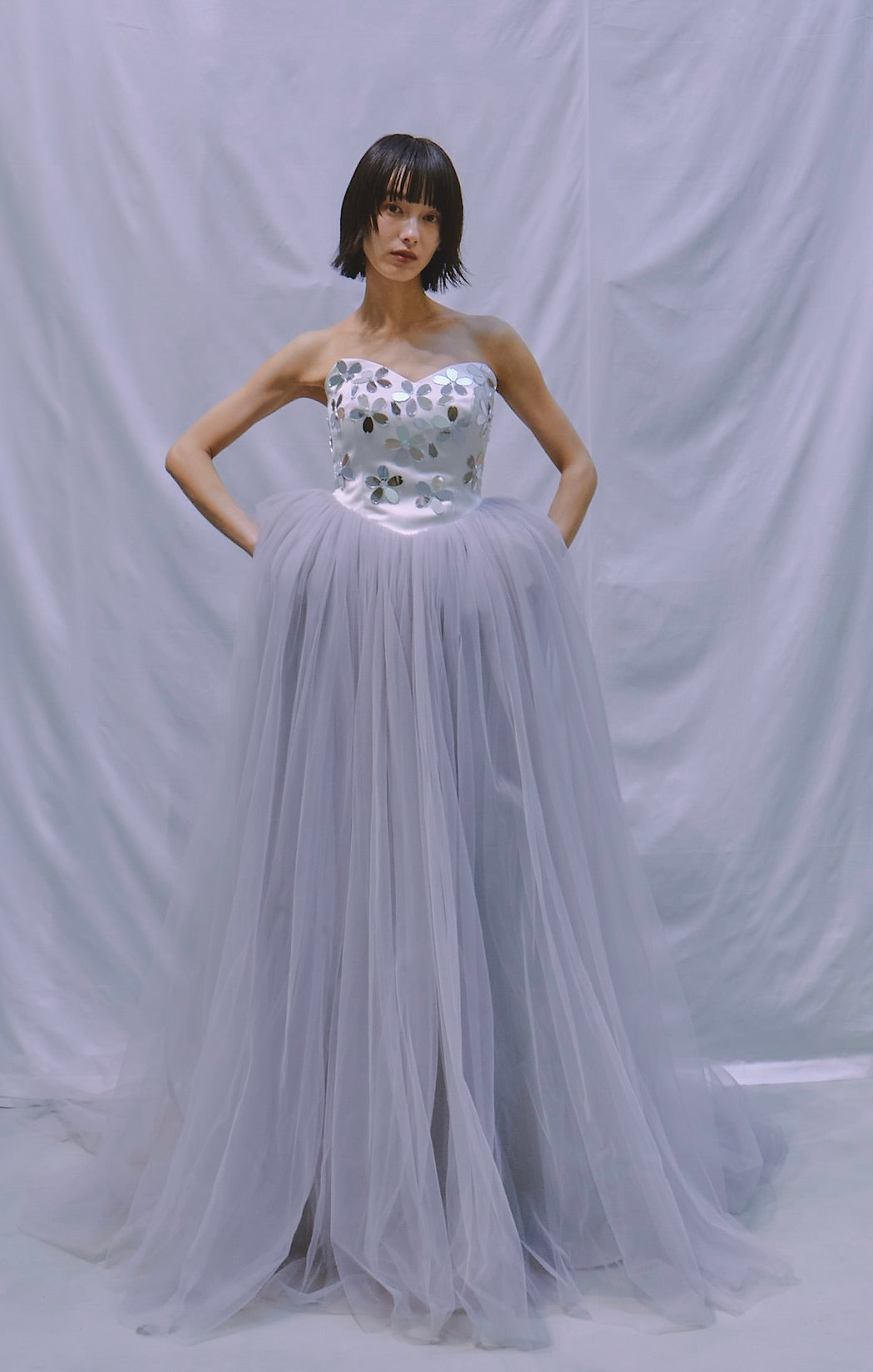華奢な肩まわりや鎖骨ラインを美しくみせつつ背中は程よく開けることで抜け感と女性らしさを演出します。