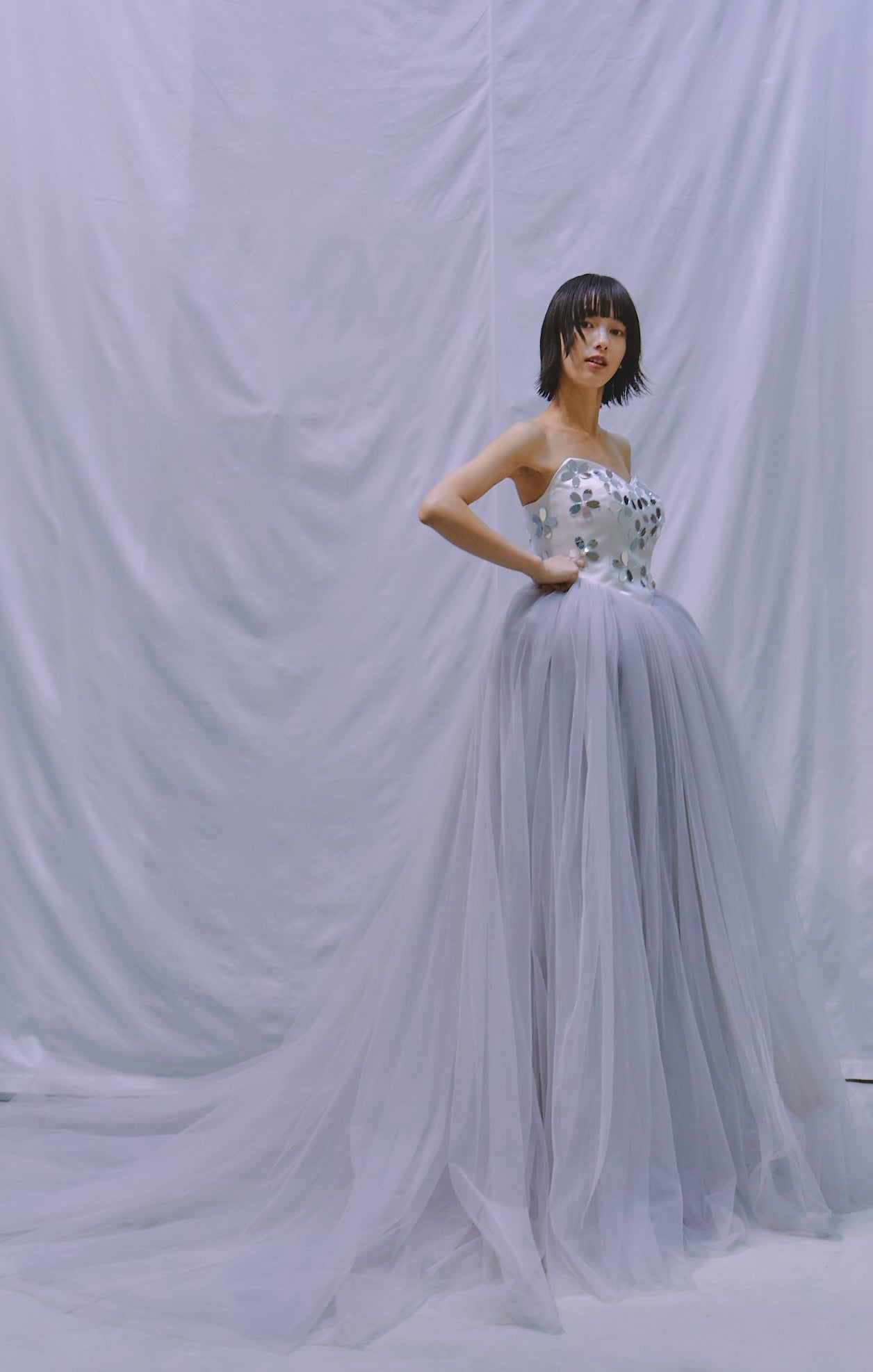 甘さを抑えた胸元のシルバーミラーパーツが〝可愛い〟だけで終わらせない、大人の余裕を感じさせる一着です。