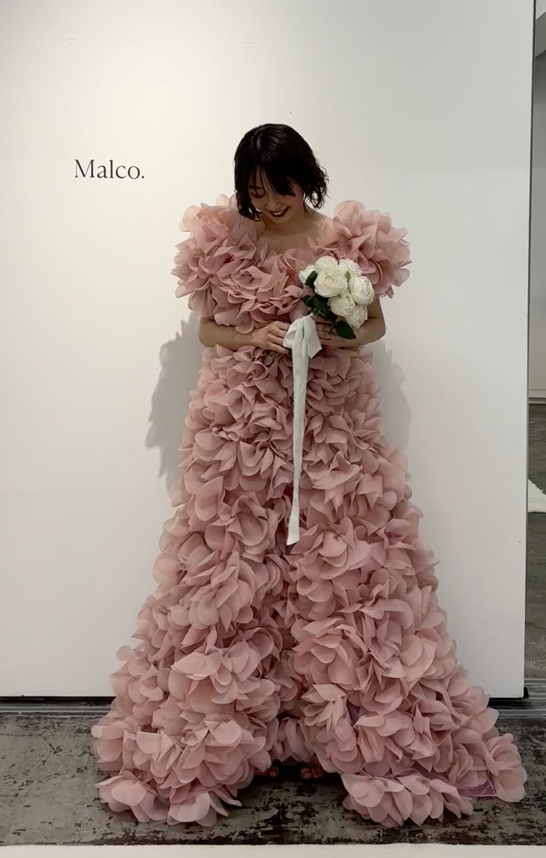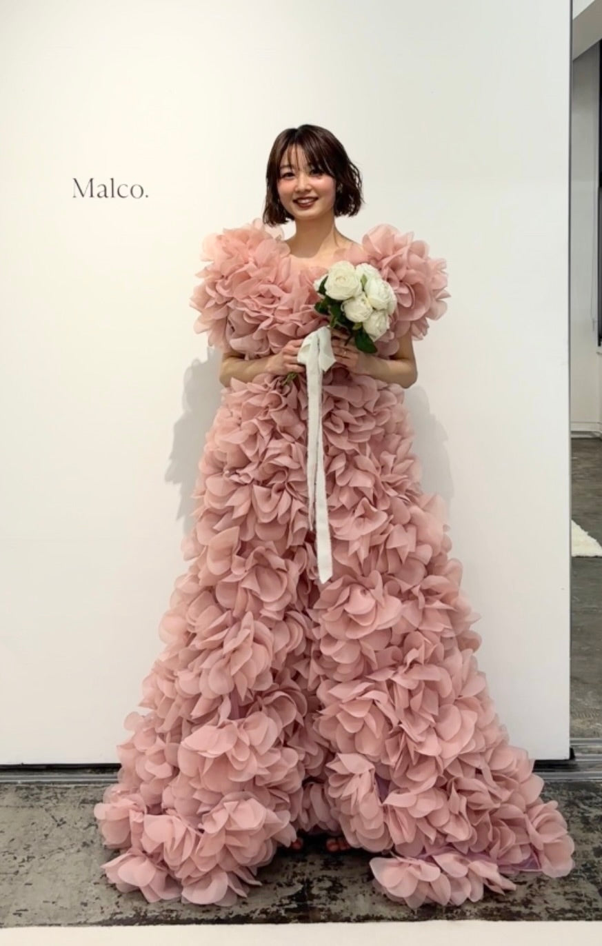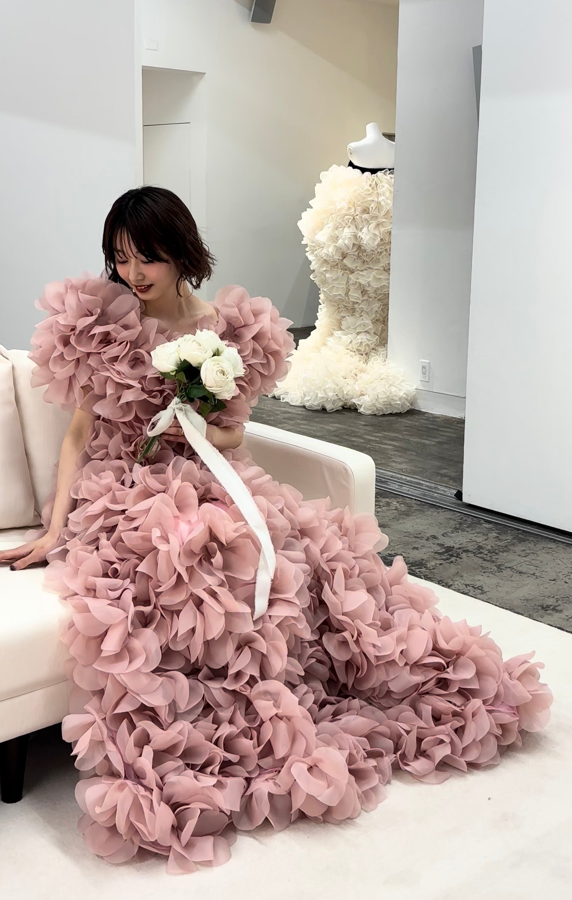 軽やかで透け感のあるオーガンジーを贅沢に用い、立体的なフラワーモチーフで全身を彩った特別な一着。幾重にも重なる花びらが奥行きを生み、動くたびにやわらかく揺れて、花束のような存在感を放ちます。