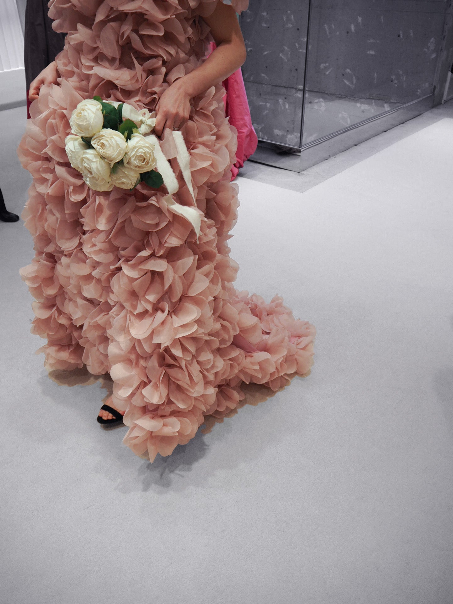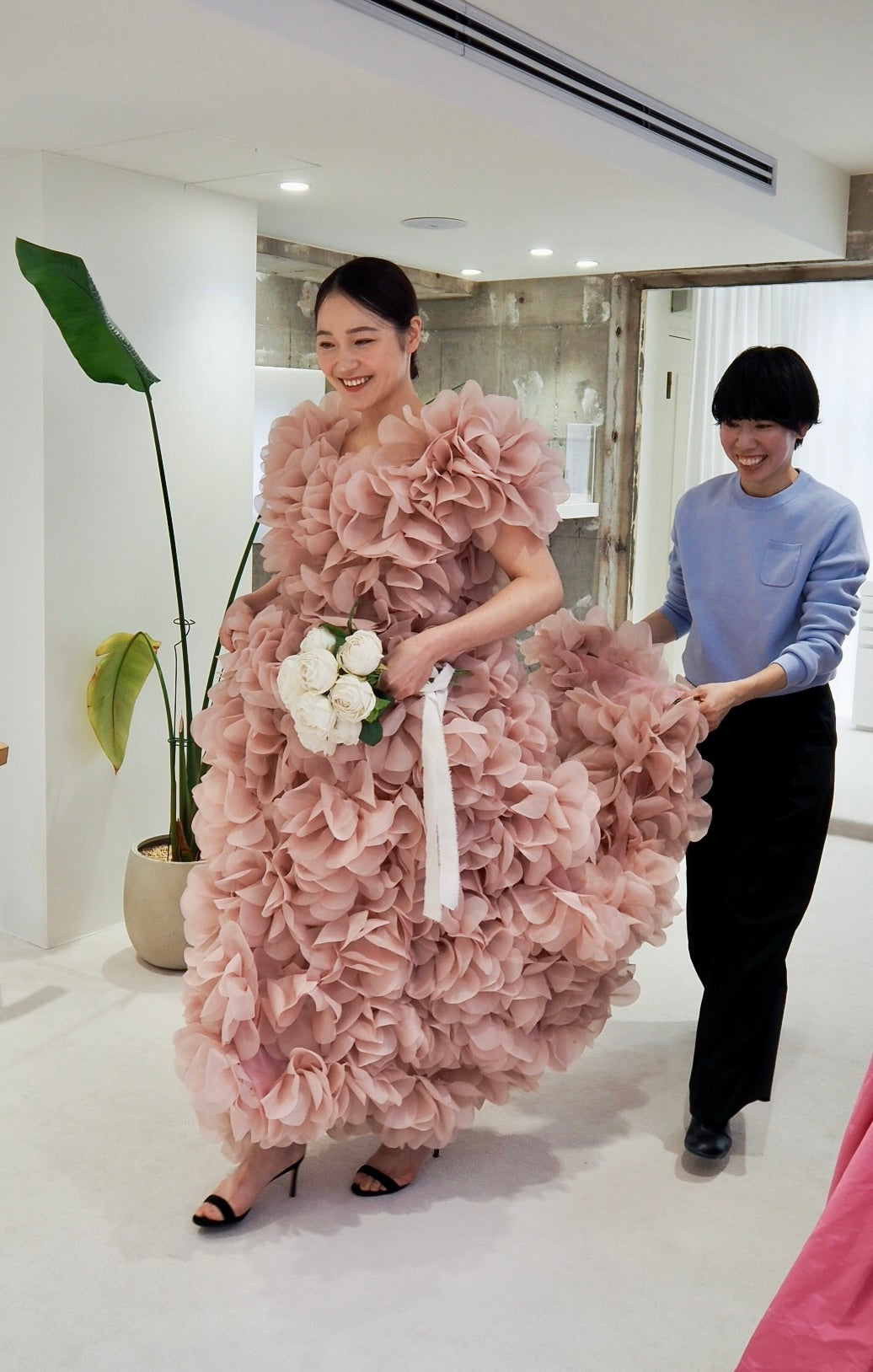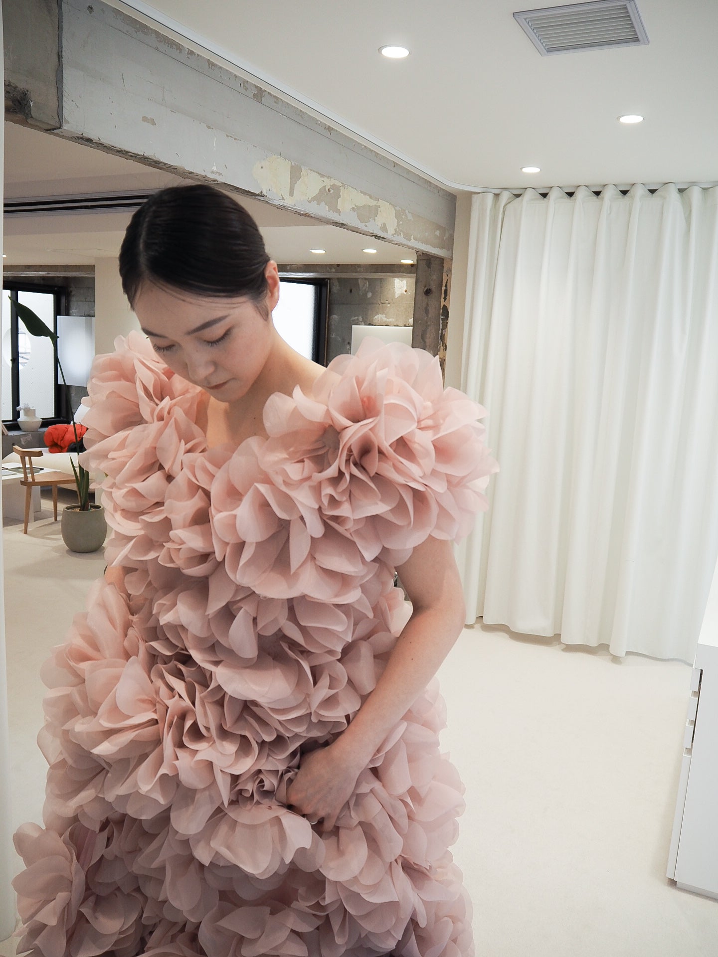 軽やかで透け感のあるオーガンジーを贅沢に用い、立体的なフラワーモチーフで全身を彩った特別な一着。幾重にも重なる花びらが奥行きを生み、動くたびにやわらかく揺れて、花束のような存在感を放ちます。