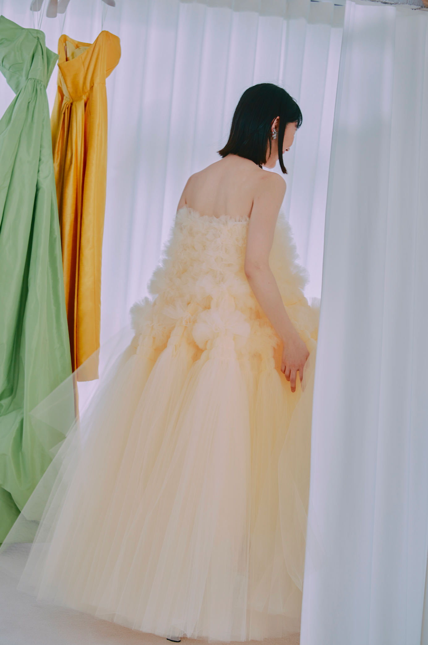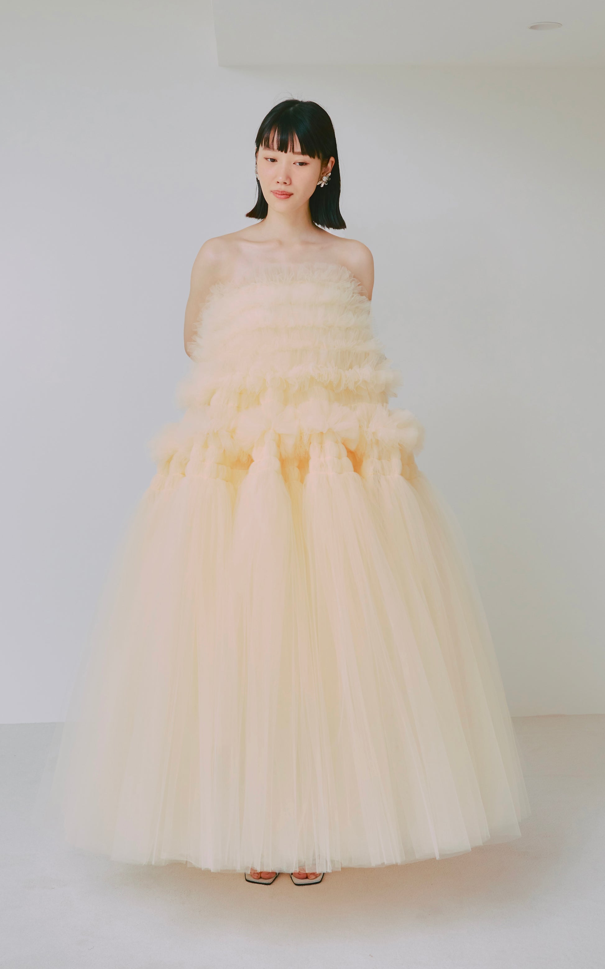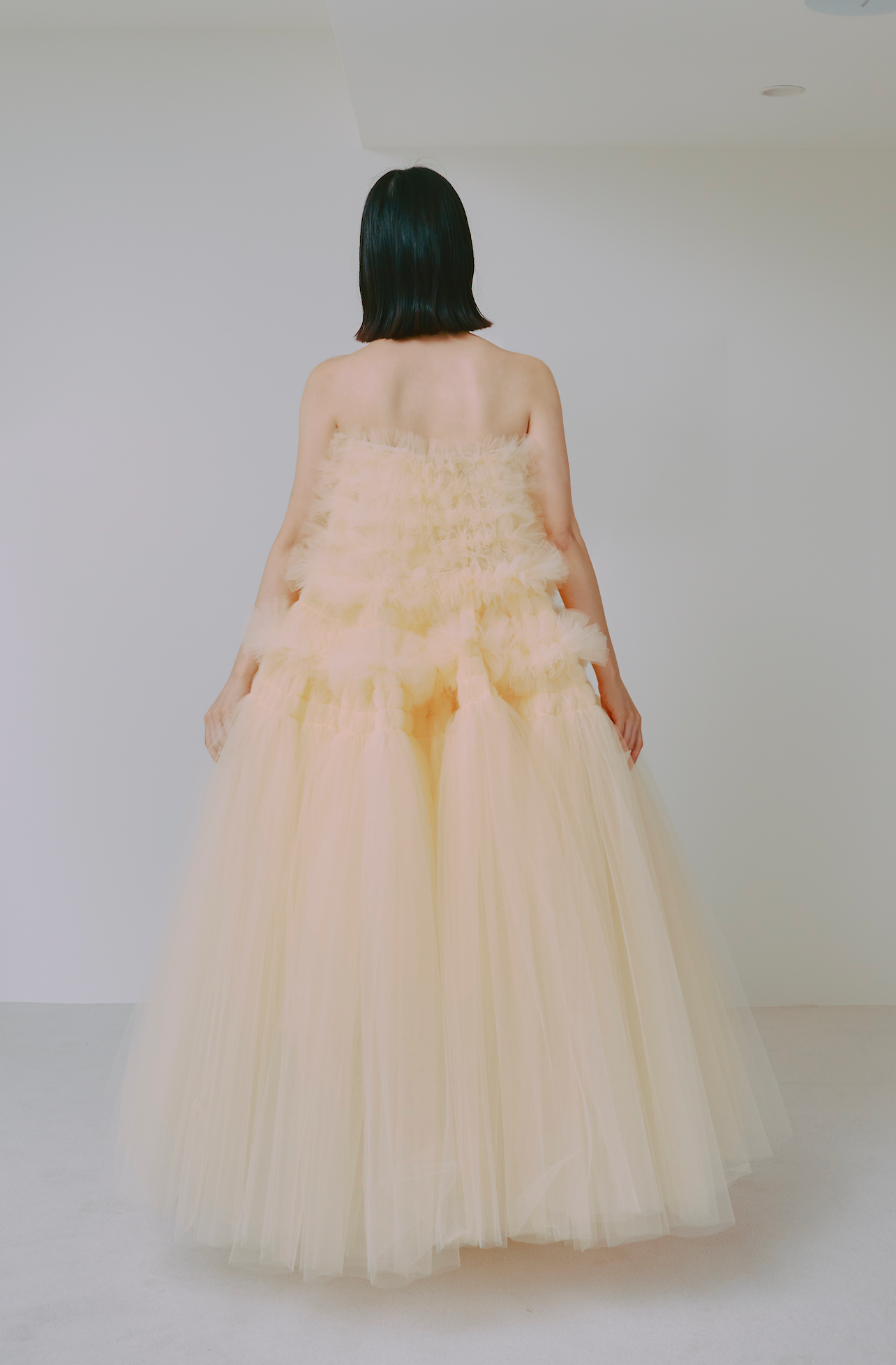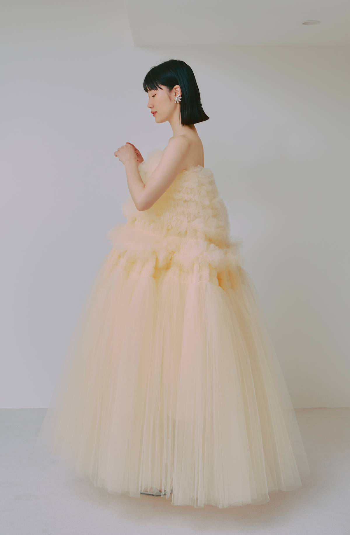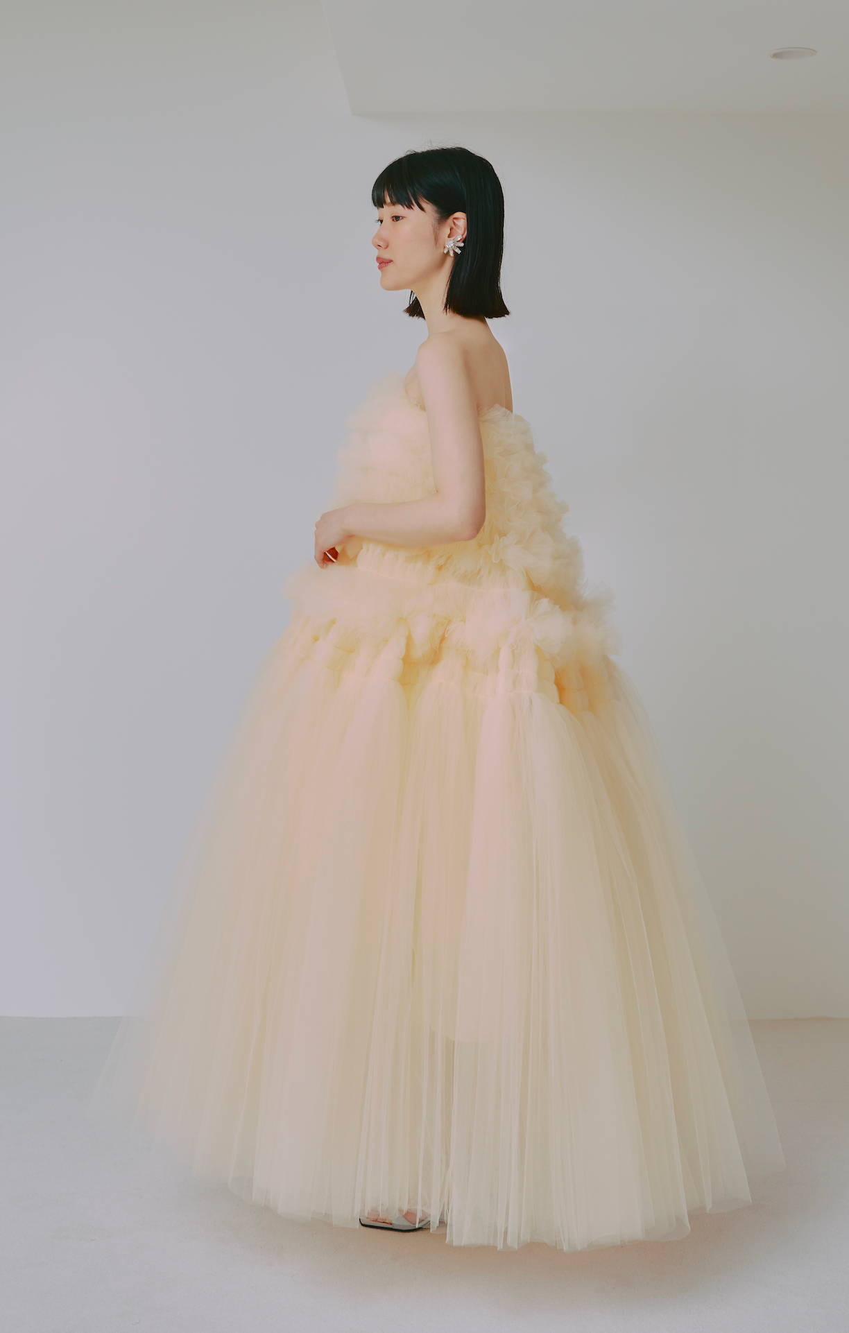 からだをを柔らかく包み込んでくれるクリーム色のチュールが何層にも重なったドレス。