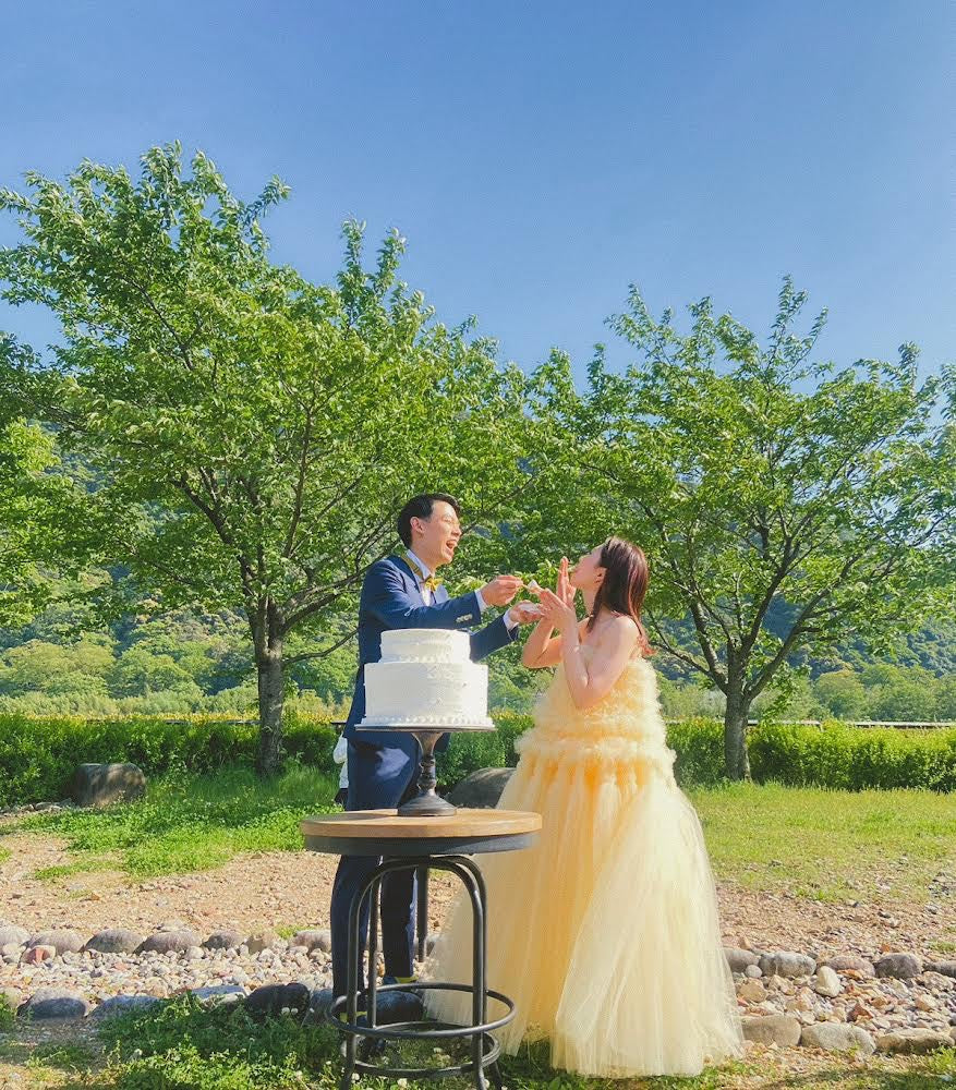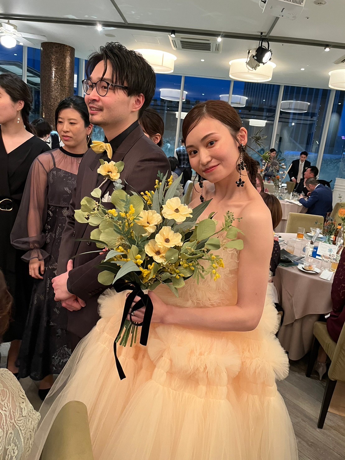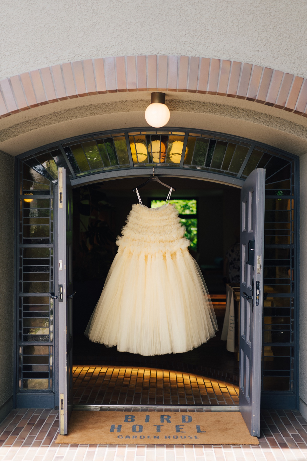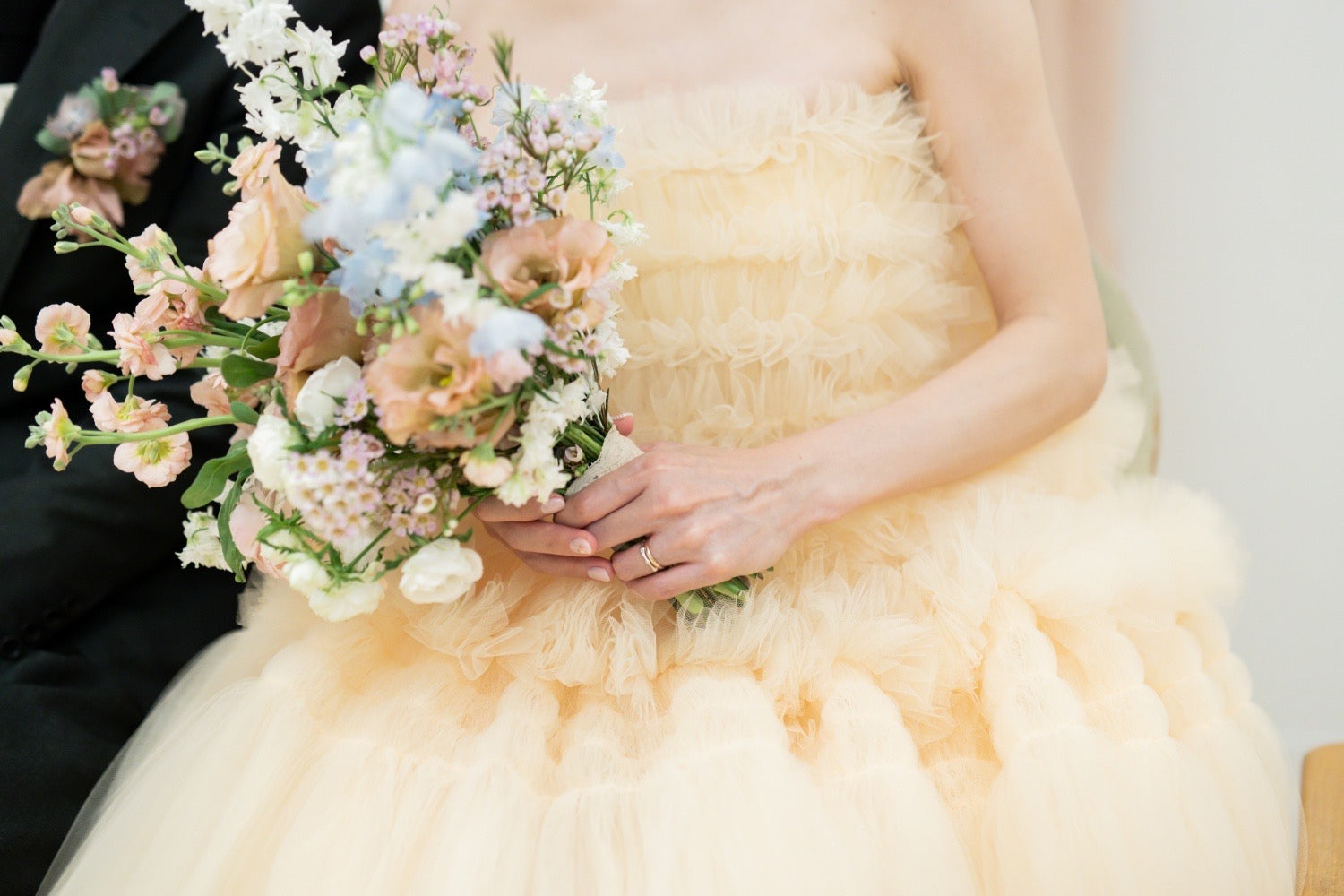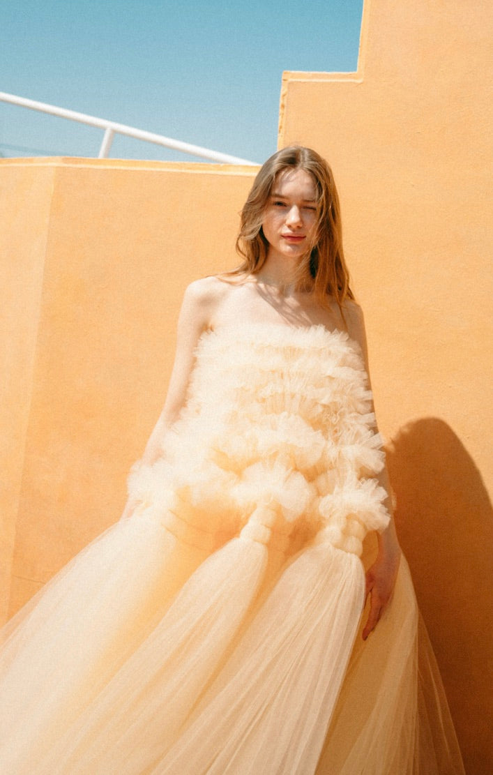 からだをを柔らかく包み込んでくれるクリーム色のチュールが何層にも重なったドレス。